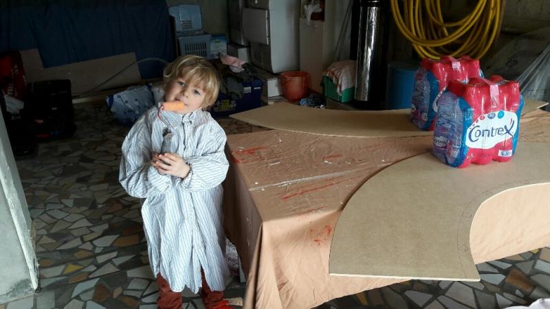 Avec mon épouse et notre fils, nous avons terminé les virages hier (sciage, peinture, clous, glissières) et le montage des modifications avec rails et bordure ce jour !!