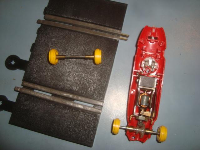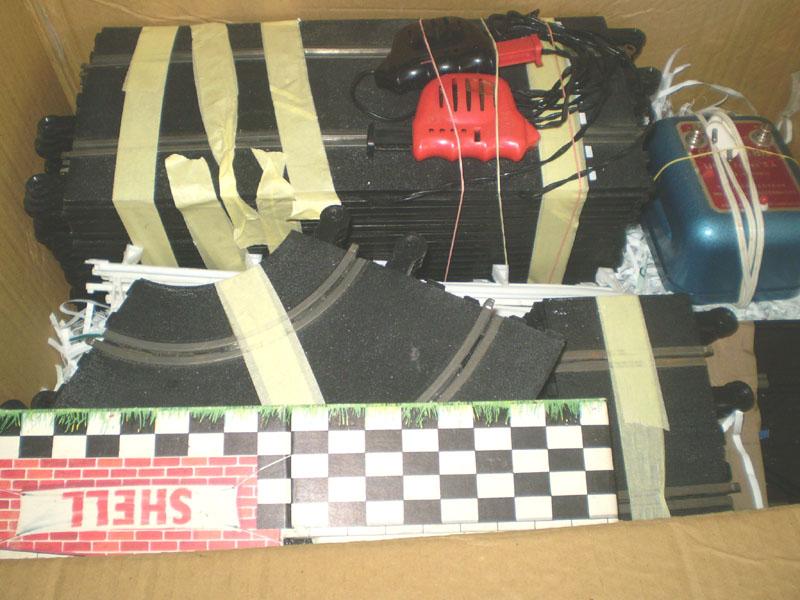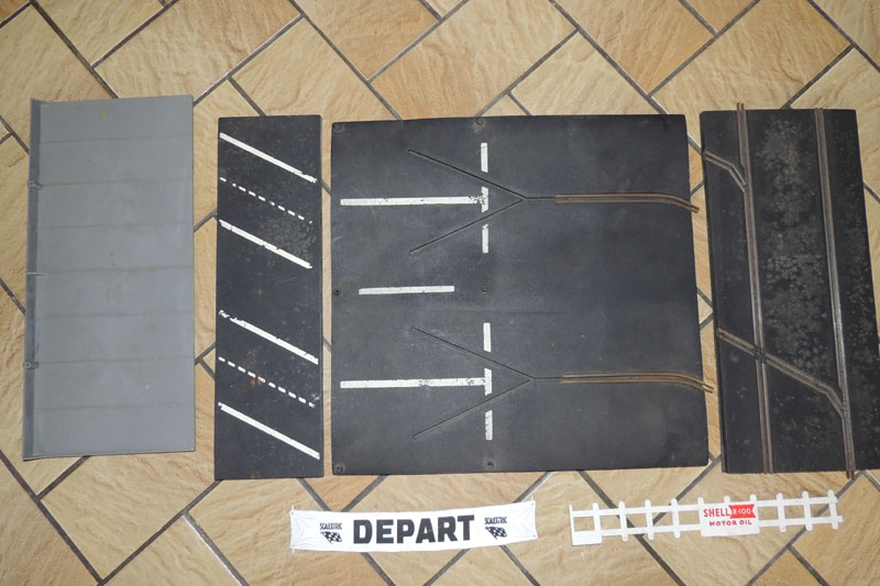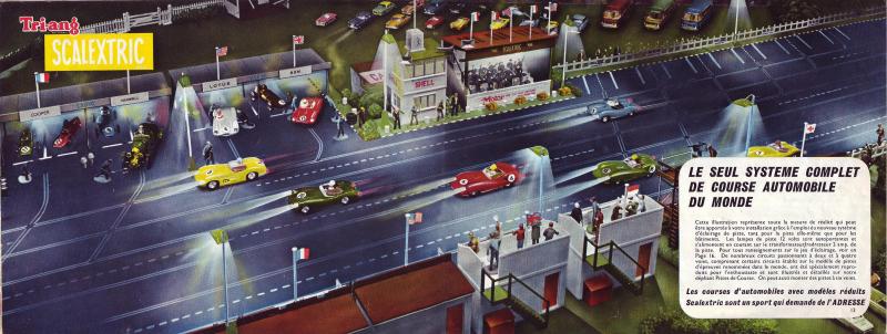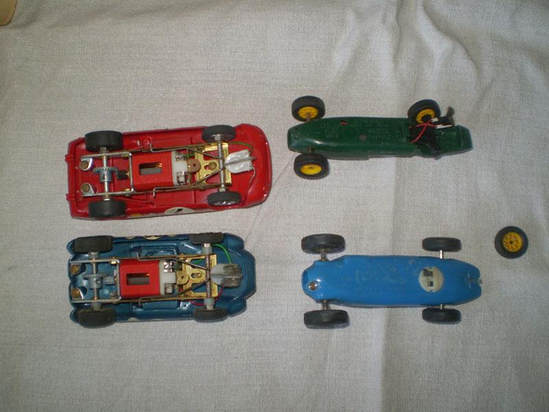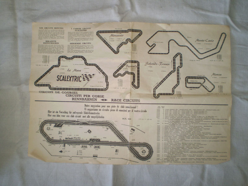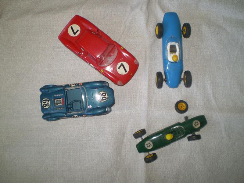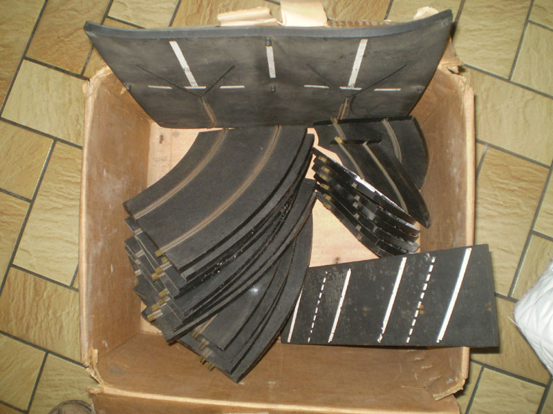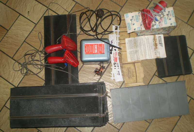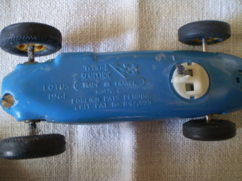 Hier, j'ai acheté 80 euros (quand même) un lot à un copain, la doc d'époque format A3 environ, plus deux A4, de la piste, le transfo, les manettes "verticales" marquées Tri-Ang Scalextric. Et quatre voitures, deux aux formes un peu rondes avec lumière plus tardives je pense, et deux Lotus, une 1961 et une Formula junior ou un truc comme ca. Seul problème, toutes les 4 sont incomplètes ou à réparer.