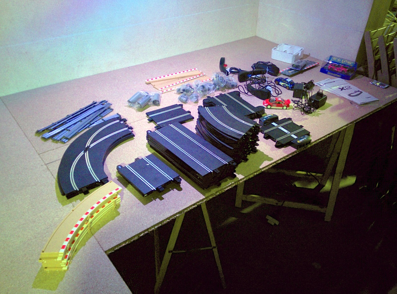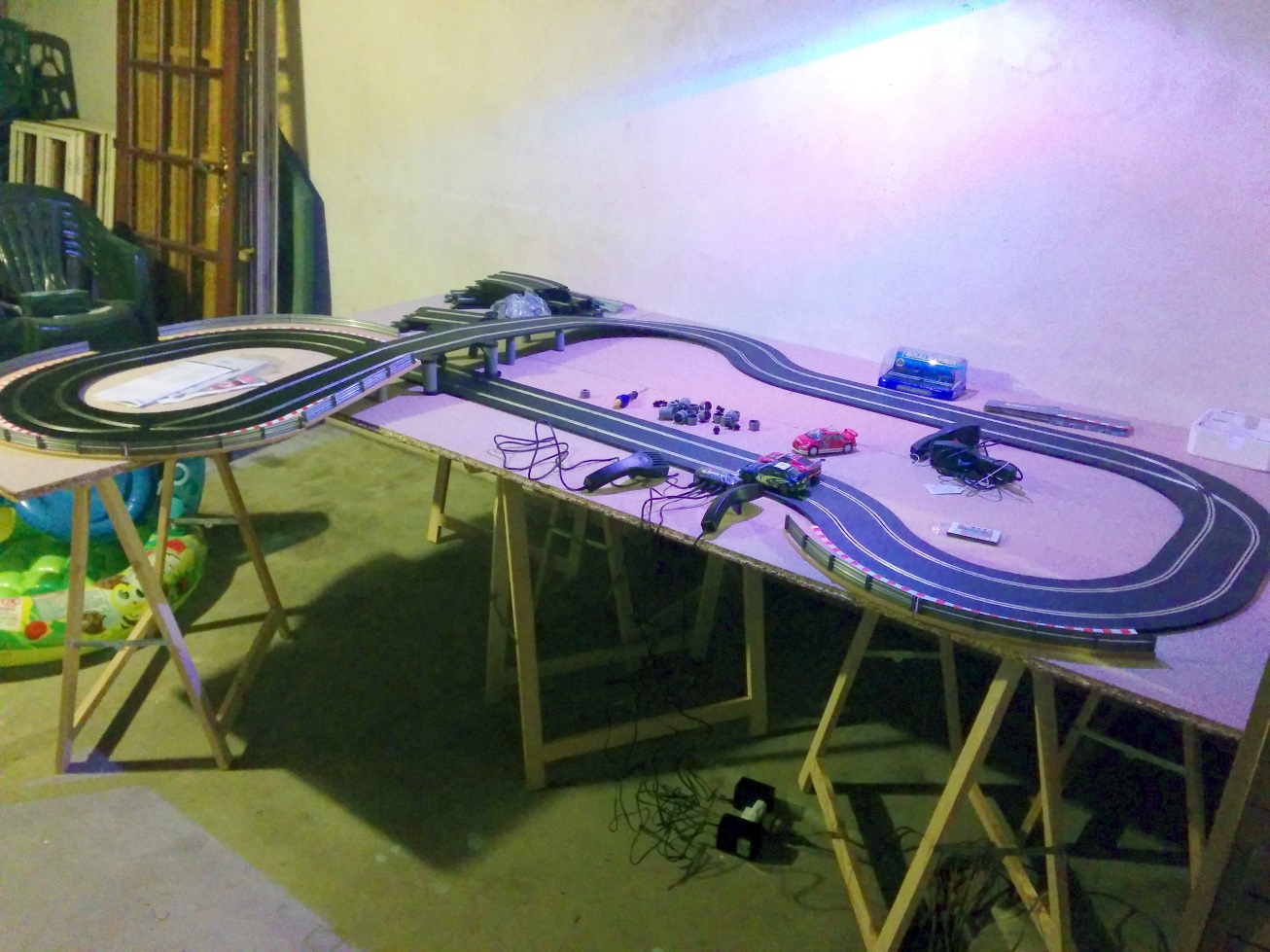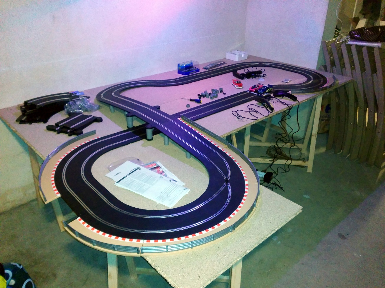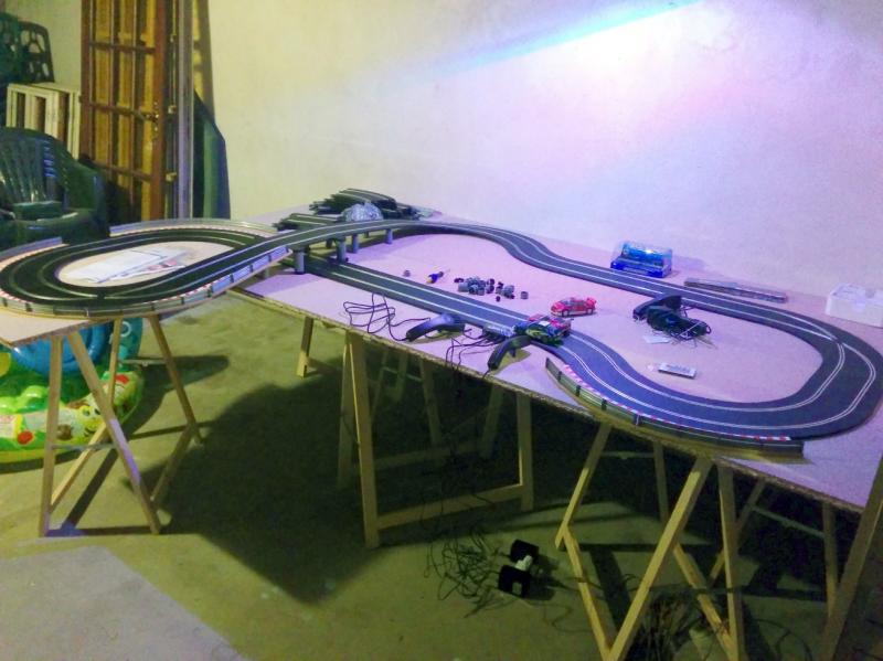 La piste est alimentée en 15V, chaque voie a son transfo. J'aurais voulu faire une grande ligne droite au niveau du rail d'alim et un vrai pif-paf au fond du plateau, mais ça ne fermait pas ...