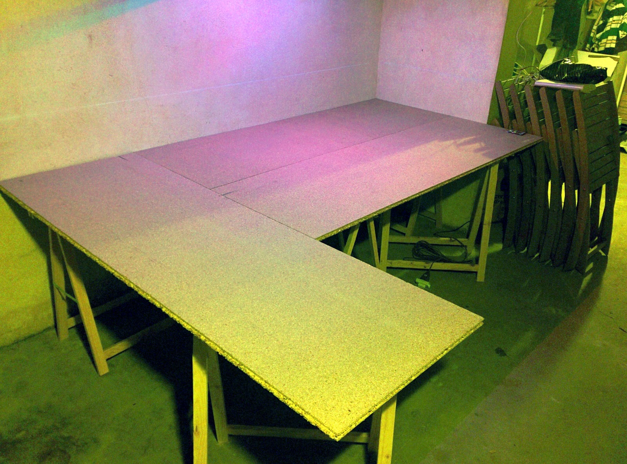 Après avoir investi dans 6 tréteaux à 3€ pièce et 3 dalles de plancher en agglo à 5€ pièce, j'ai pu avoir un support pas cher et relativement confortable :
