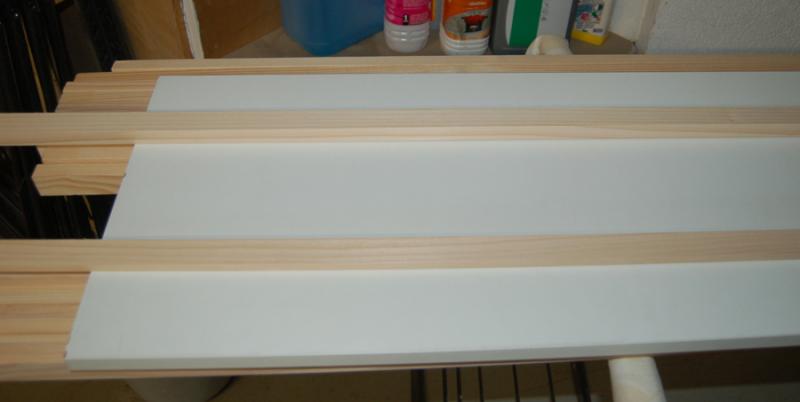 Il me manque encore quelques étagères, mais j'ai déjà tous les tasseaux. Au menu donc, comme il y a 3 armoires de 7 étagères dotées chacune de 2 rangées d'autos (donc un tasseau fin et un épais), ... vous faites le calcul ... je n'ai plus qu'à mi mettre pour couper mon bois et le pré-percer ... pour ensuite le fixer à mes 21 étagères. Sinon, une lèvre en caoutchouc sera fixée à l'intérieur d'un battant de chaque armoire afin d'éviter l'entrée de la poussière par le fente entre les 2 battants. A suivre !