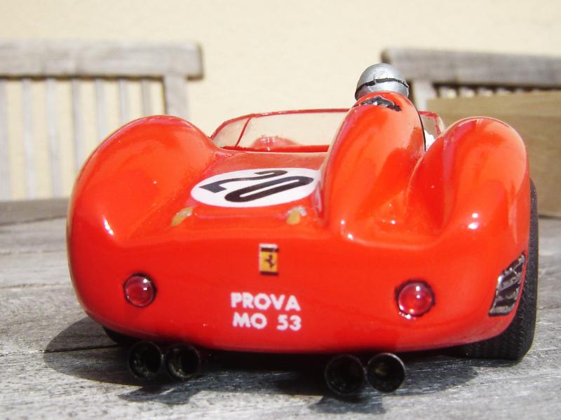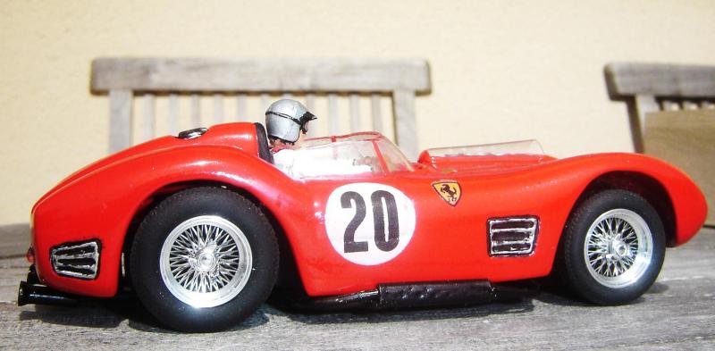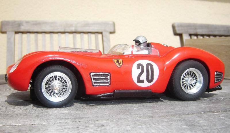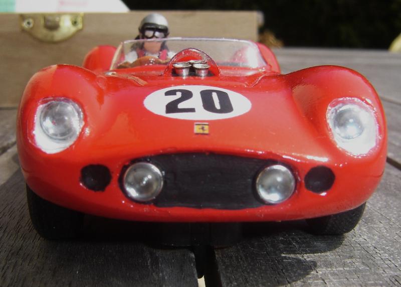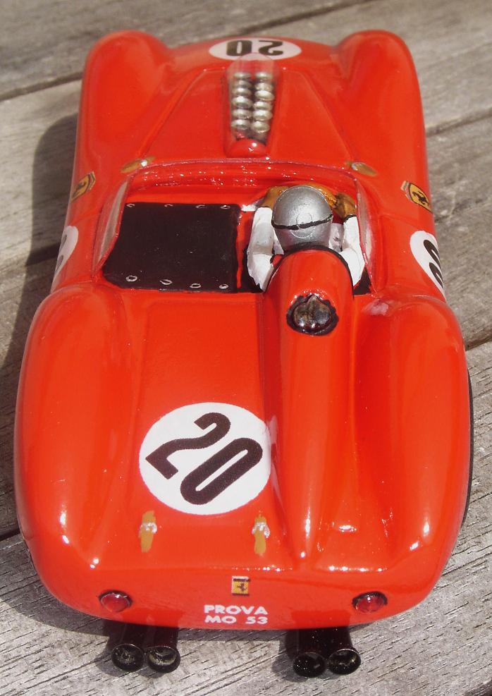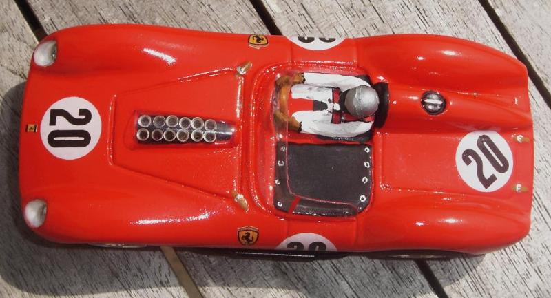 donc retaillage des passage de roues qui n'étaien pas allignés,rebouchage des bulles dans la carrisserie,gravage des grilles latérales,thermoformage des bulles de phare puis perçage des phares, coulage des puis de vis en résine,ponsage et perçage des pipes d'admission,commande de décalques chez pattos,(j'aimais pas trop les rond à découper car demandant trop de précision du coup de ciseau)recherche de photos sur le oueb pour faire les pots d'échappement,confection des pots en laiton,peinture,vernis, pose des décalques,2 autres couches de vernis, pose des pipes faites avec des embouts de cablage de 1,5 mm2. collage des optiques des bulles de phares et pare- brise,la bulle de capot manquante à été faite avec un emballage de fraise dremel et voici le résultat!