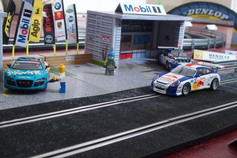 Pour la déco, on a bricolé entre noël et nouvel an avec du MDF, des bouts de plastiques de récup, des feuilles autocollantes et une imprimante Laser. Les panneaux de Pub, Les stands pour ranger les voitures et la mythique Passerelle Dunlop !. Les meccanos, eux, ont eu droit à une promotion de leur boite Lego vers le carton Ninco.