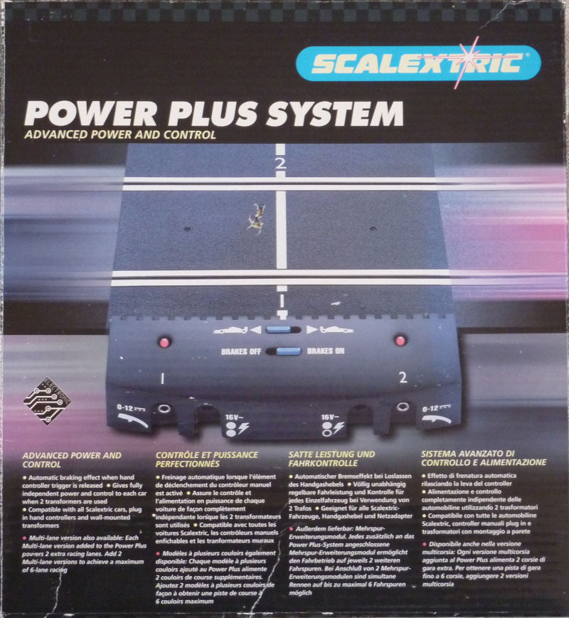 Si oui, saches qu'il existait une "double PowerBase" classique (appelée Power Plus System) qui à la différence de la "Sport" permettait de désactiver le sytème de freinage et aussi d'inverser le sens de circulation des voitures. Elle nécessite des poignées Classic dernière génération (identique extérieurement aux Sport) ou des poignées de Micro Scalextric mais tu pourras y brancher les vieilles poignées Scalex à condition de changer la connexion en mettent une prise Jack mâle de type "mono".