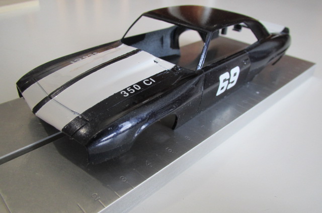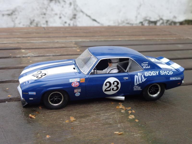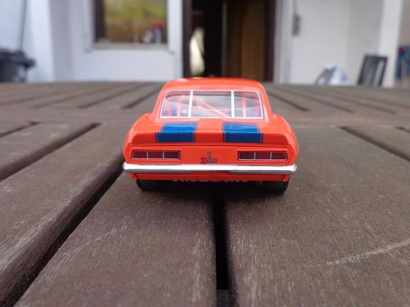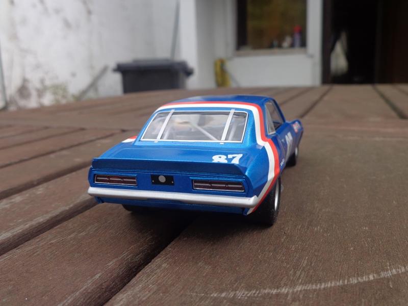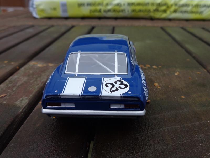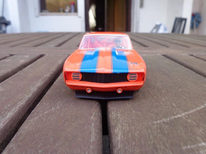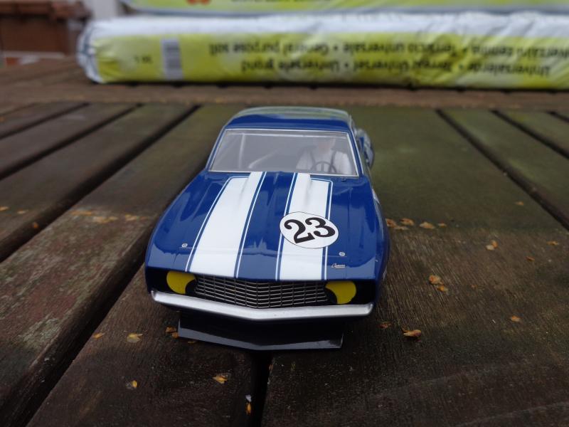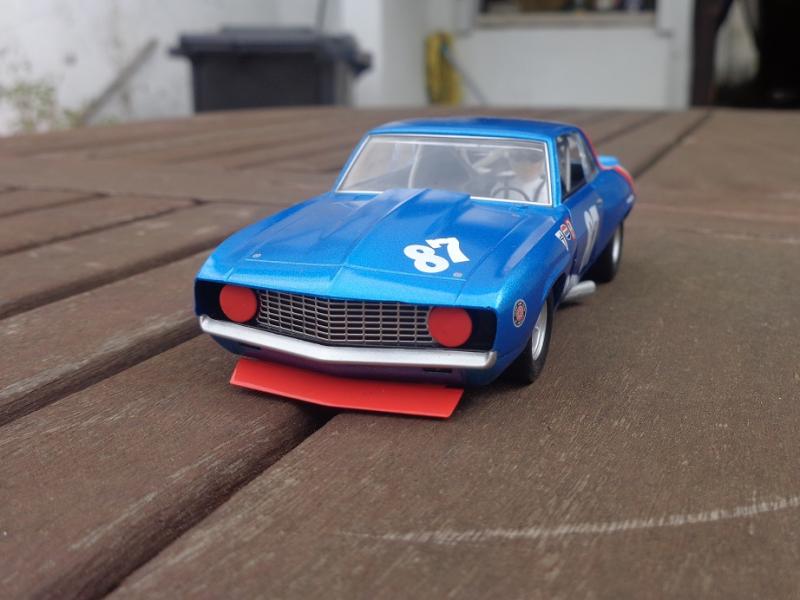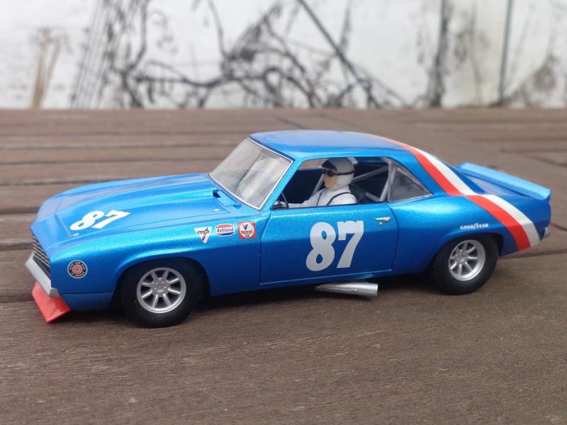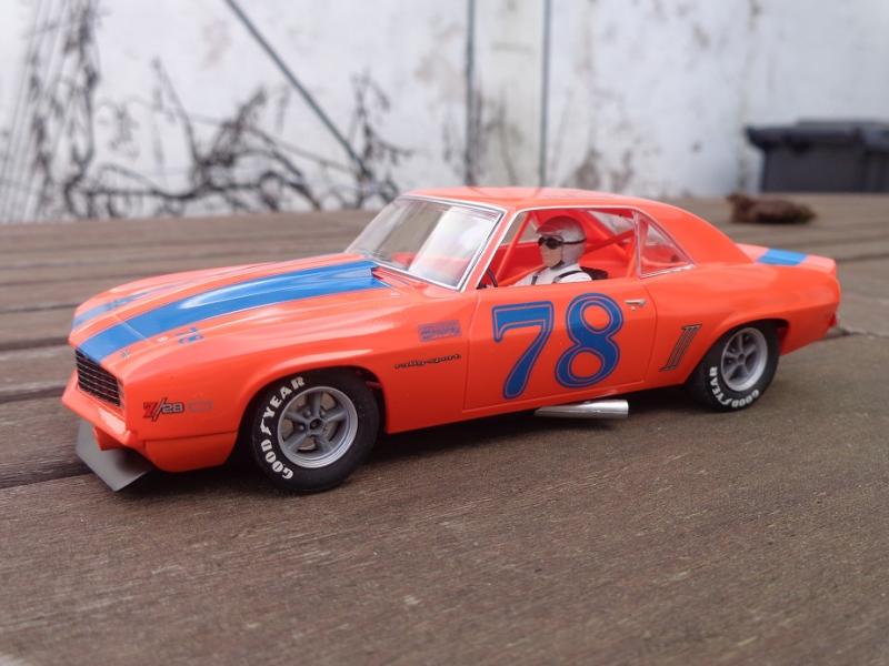 Sur la Camaro Scalex (j'en ai 3) : roues d'origine à la poubelle, jantes alu CB Design, pneus arrière uréthane Paul Gage ou caoutchouc Slot-It P6 (selon les pistes), pneus vernis à l'avant, guide Slot-It avec adaptateur B-Nova, couronne alu Slot-It, axes Slot-It, lest avant et arrière, rognage du châssis et du fond de l'habitacle pour le tilt, etc.