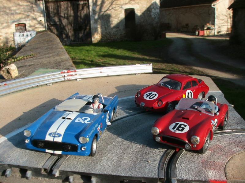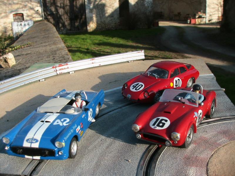 Thundebird carrera sur son chassis d'origine, mais bien modifié ,jantes Pioneer ,couvre tonneau ,pots alu et par brise maison.Peinture perso .Reste les caches longues portés à poser .L'alfa est une mmk sur chassis slot classic et les inserts sont maison .La cobra est la carrera rabaissé (merci mon Doc !) petite modif du pilote , léger voile mat et usinage des pneus avant au tour .