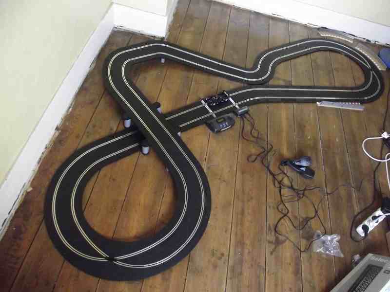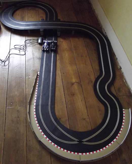 Samedi, j'ai craqué, en achetant la boite "Total Endurance" de Scalextric, ainsi que 4 demi courbes à 45° (je souhaitais "casser" la descente de pont en aménageant une sorte de chicane). En voici une photo aussitôt après déballage :
