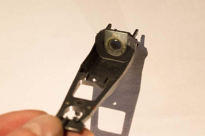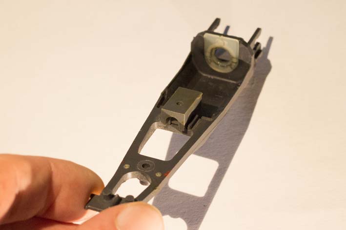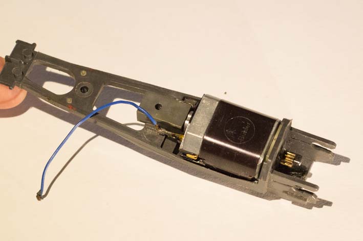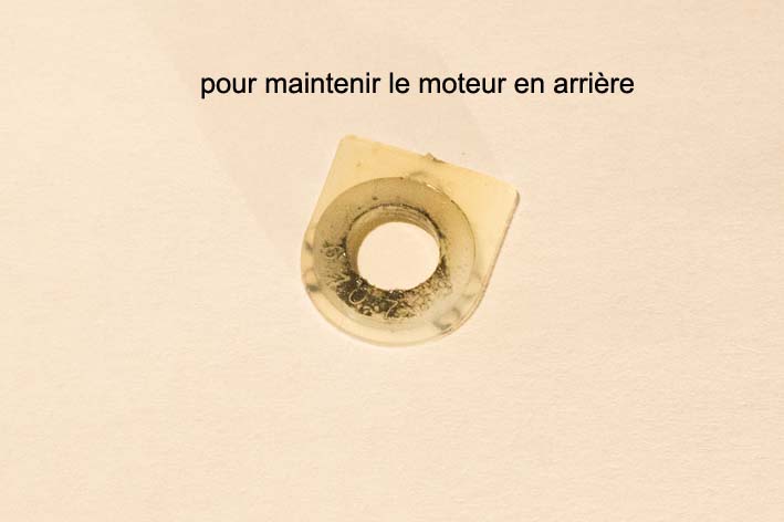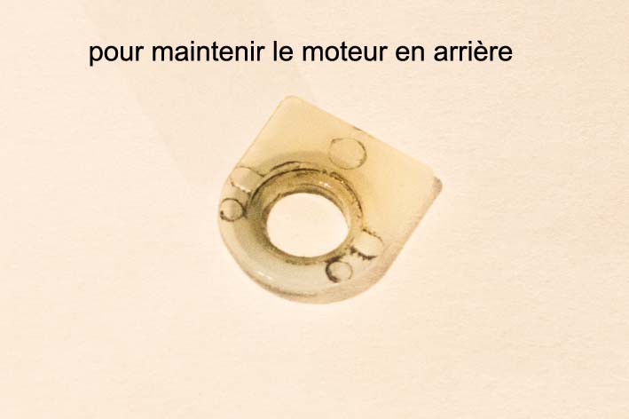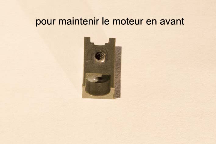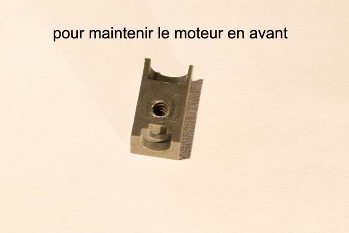 le moteur est maintenu d'un coté par un embout qui se visse sur le chassis et qui possède deux entrees différentes (peut etre pour l'utilisation d'un autre moteur sur cette voiture?) et de l'autre un anneau blanc qui se clipse sur le chassis