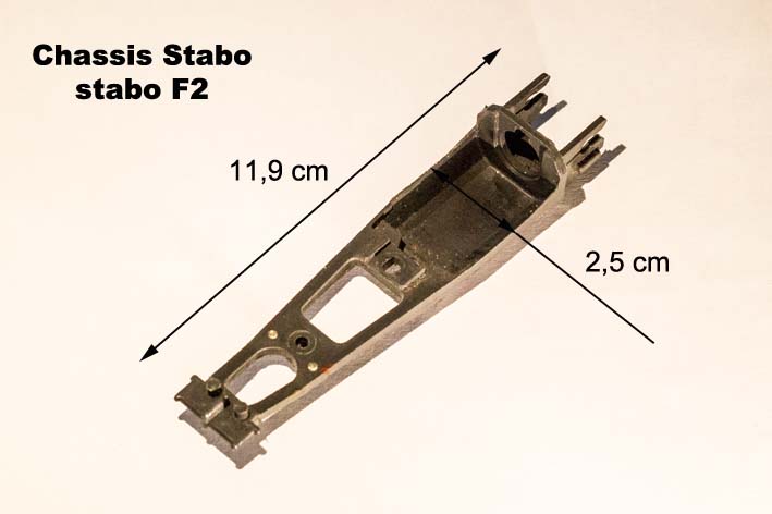 le chassis de la F2 fait 11,9cm de long, largeur max 2,5 cm