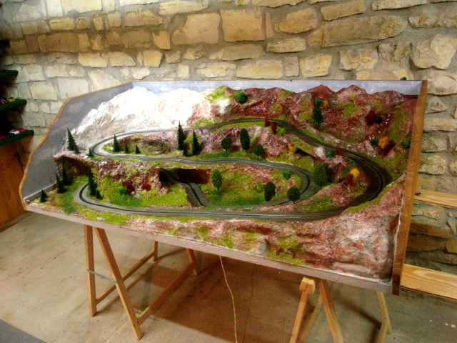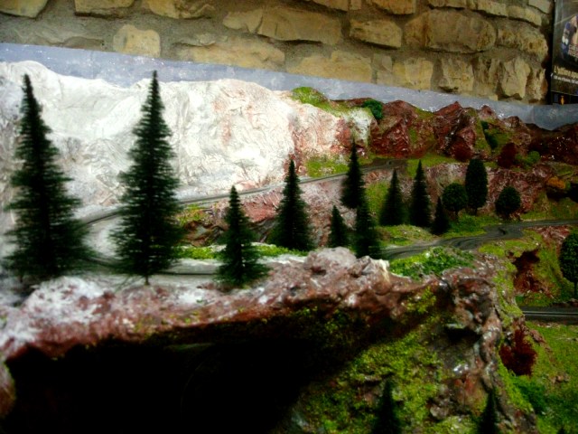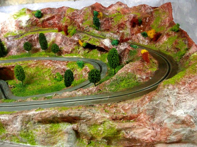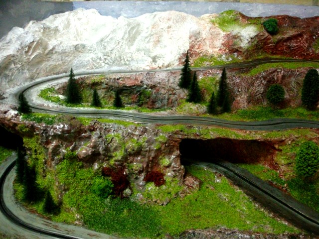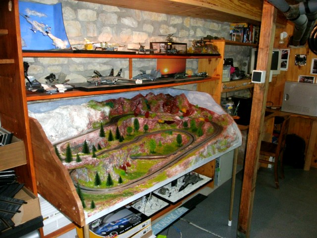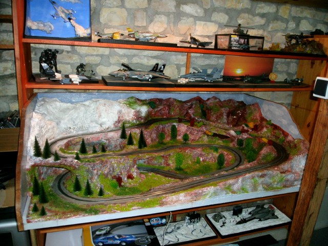 le miniworld est etrminé en grande partie...jai pas fait de chute deau pour l instant... juste couler un peu de résine...on verra plus tard... peint le ciel en bleu...et voila... il a trouvé ca place endessous de mes dios et maquette... car a lautre emplacement un projet de 2 pistes...