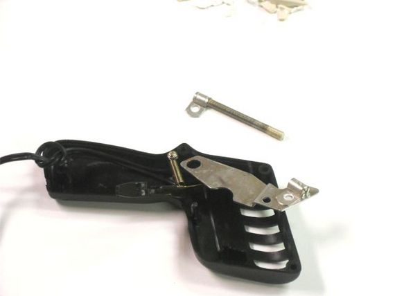 On ouvre ensuite la poignée (ici, une Tomy mais vous vous doutez bien que ça marche aussi avec Aurora, Tyco et les autres poignées à gachette sur lesquelles vous aurez mis la main) en deux. C'est clipsé et parfois collé également.