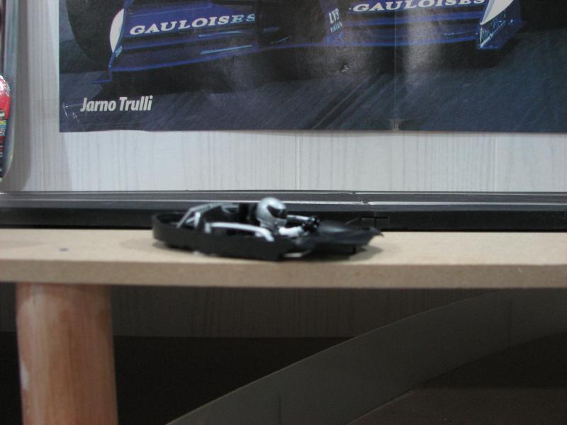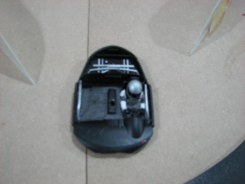 Voila pour l'habitacle j'ai juste deux photos..... Enlever le bas de l'habitacle, remplacer avec un carton noir pour faire un genre de plateau et coller dessus les morceaux du pilote de la cage et le volant...et oui il faut couper le pilote en morceaux..
