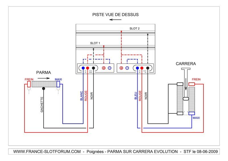 J'ai des anciennes poignees scalextric avec deux fils que je veux remplace par des parma qui on trois fils comment faire les branchements Merci d'avance