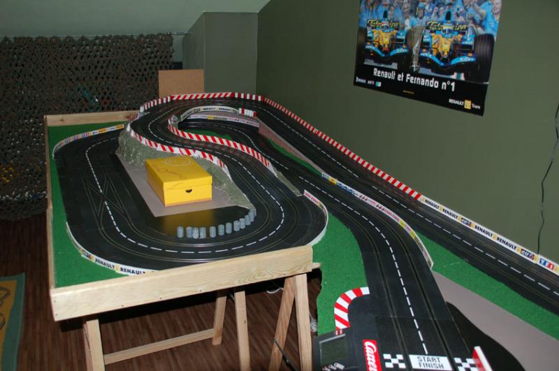 De quelle courbe rapide parles tu ? du virage relevé ? je n'ai pas la place car je suis sous comble et la piste vient au contact du toit. J'ai les bordures pour virage relevé mais elles sont énormes et cela passait pas. En plus dans le banking tu es obligé de mettre des barrières parce quand cas de deslotage tu retrouves ta voiture à l'autre bout de la pièce.