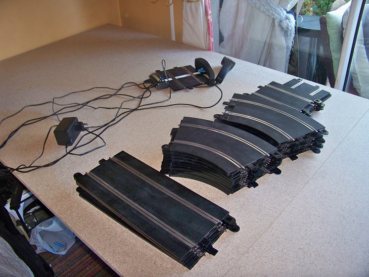 j'ai en tout 20 courbes R2 45°, 5 droites standard longueur 350 mm, 'Sport' , 5 demi droites de 17,5, 2 raccords droit, longueur 78 mm, 'Sport' et un transformateur scalextric sport