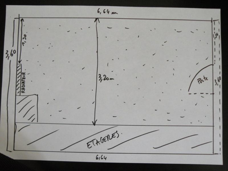 Le plan de la pièce (La zone en pointillé est l'espace exploitable) L'idée est de coller la ligne droite en haut du plan contre le mûr :
