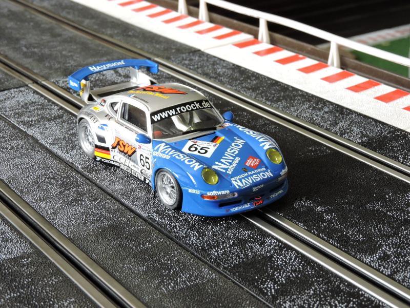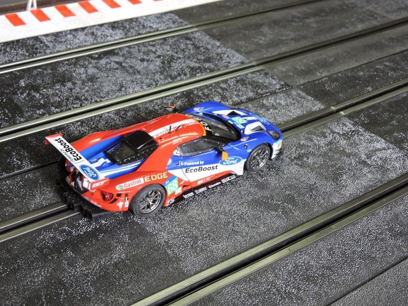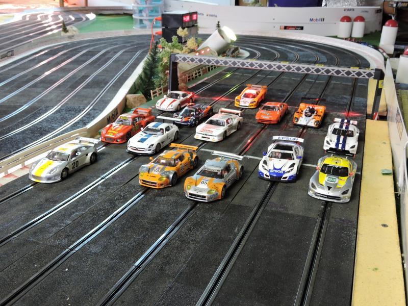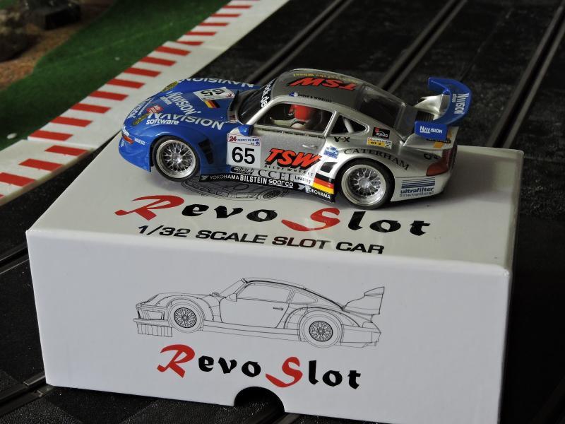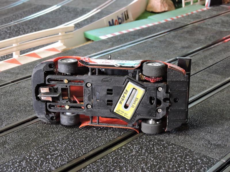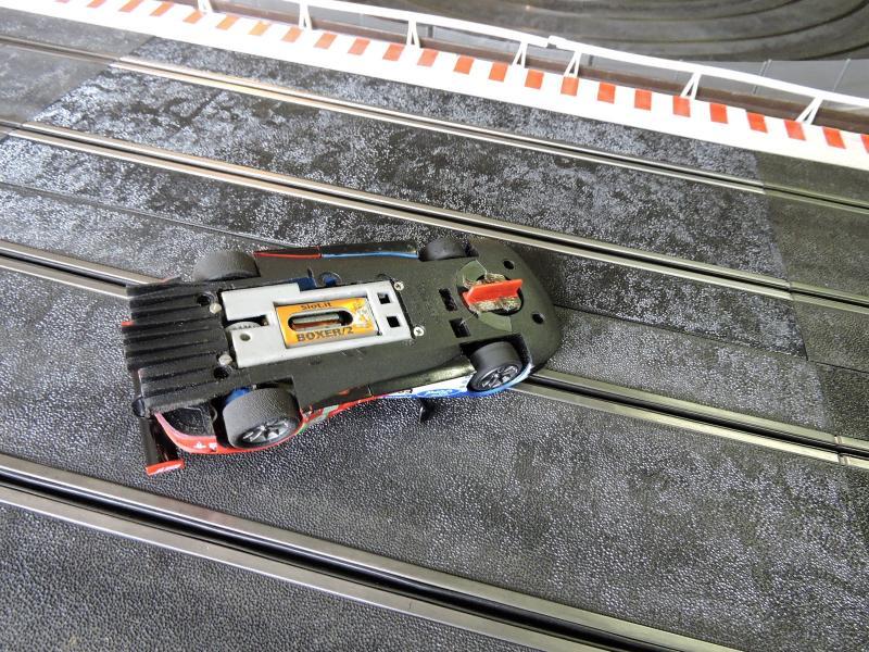 , le train avant sans aucun jeu et bien sur monté sur bagues , découpage du chassis pour y intégrer un bati Slot It inline ( pas moyen d'y mettre autre chose ) avec un Boxer 2, installation d'un support d'axe avant réglable , changement du guide ,enfin bref peu de choses, essais et là, miracle ça marche plutot bien
