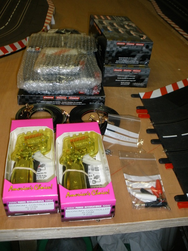 les rails et bordures qui me manquait, 2 poignées parma eco, 2 ressorts plus dur et fiches bananes,et 2 cablages de maintien de tension carrera de 5 m