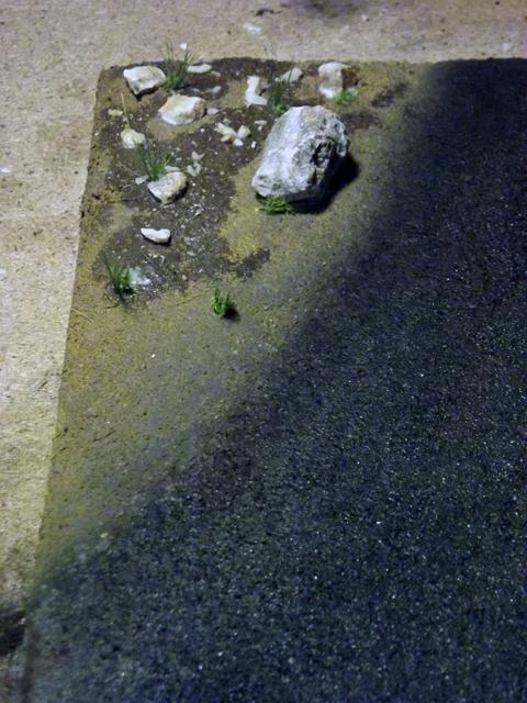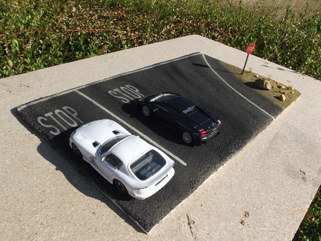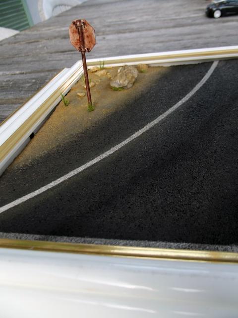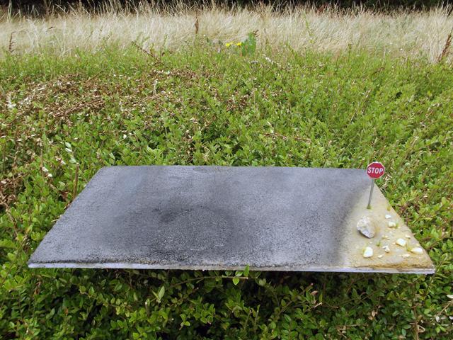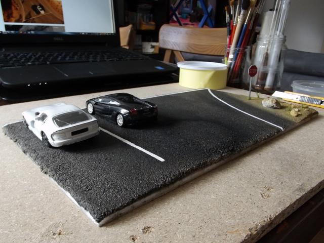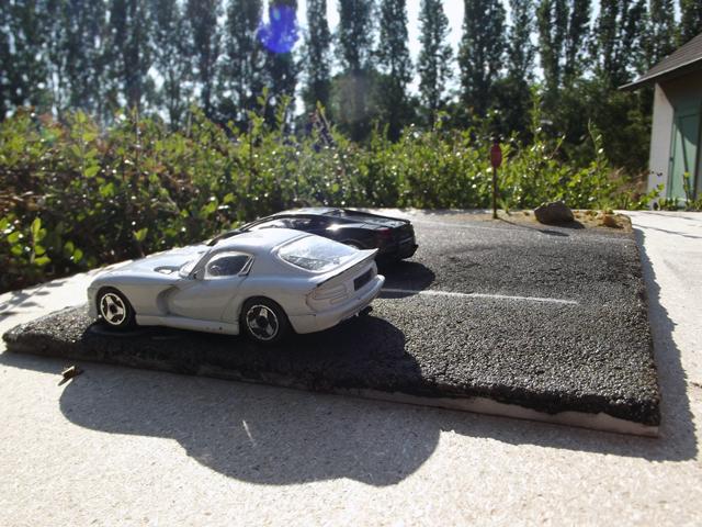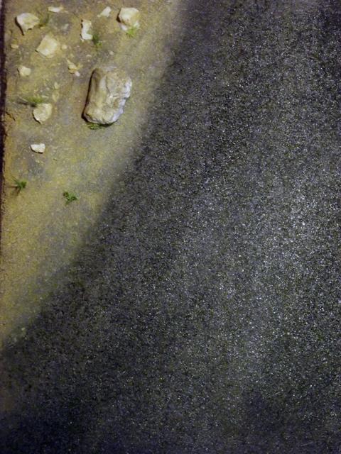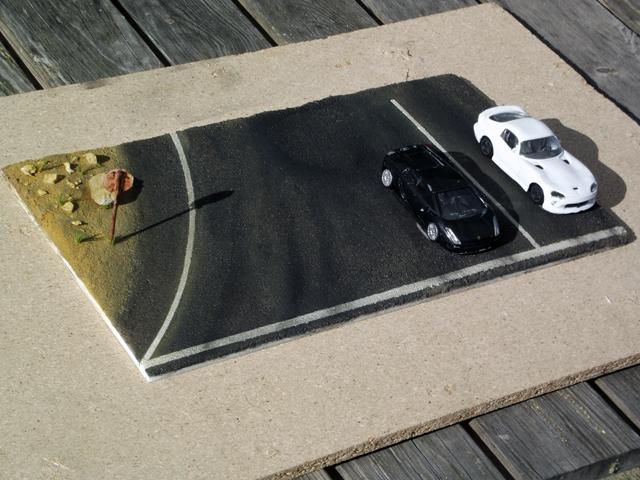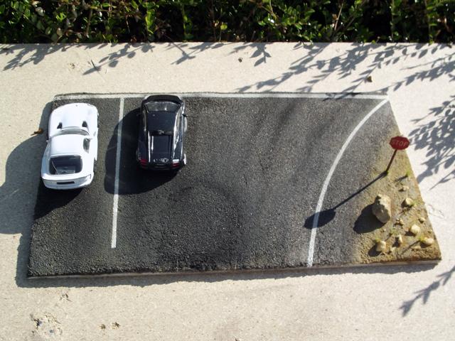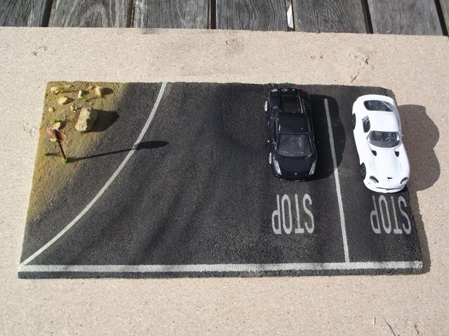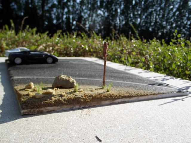 Comme la patine de l'asphalte était fini, cette fois, j'ai uniquement bouché le trou. J'aurais même pu faire une découpe rectangulaire pour imiter une réparation de la route