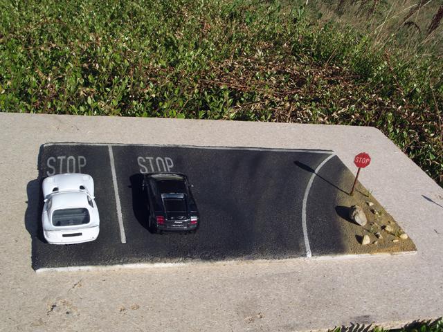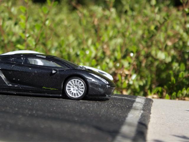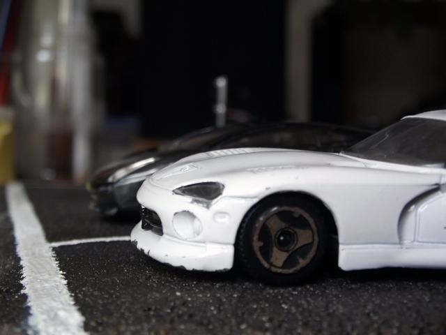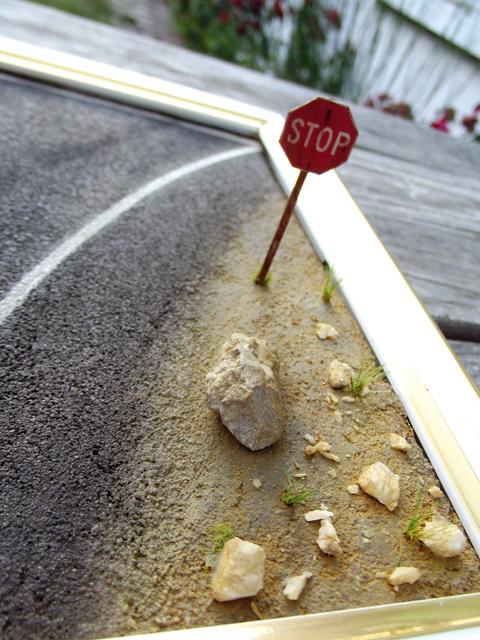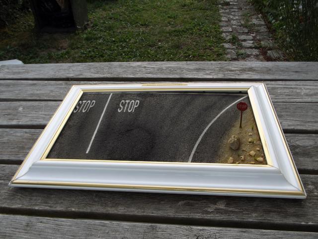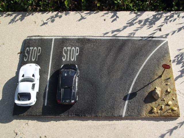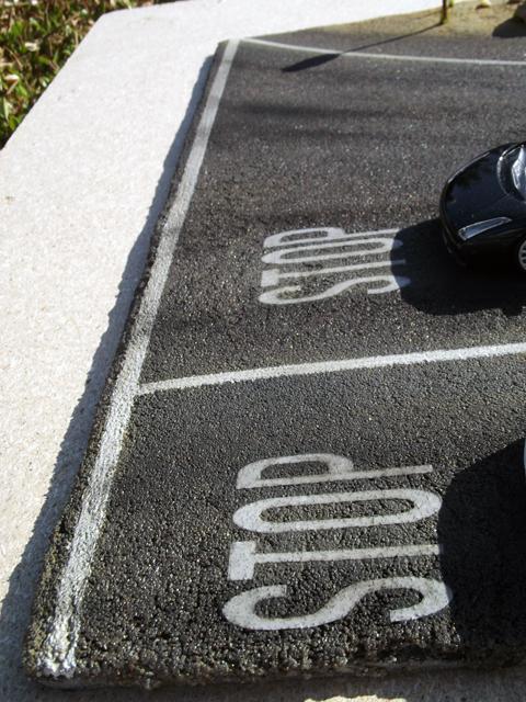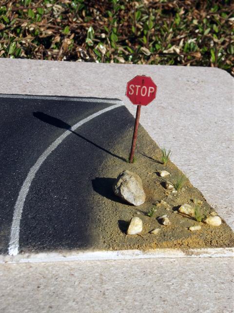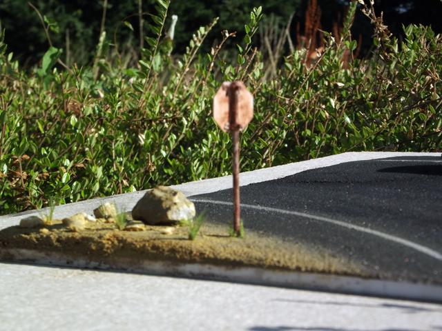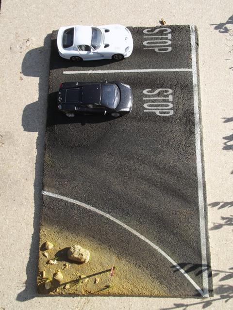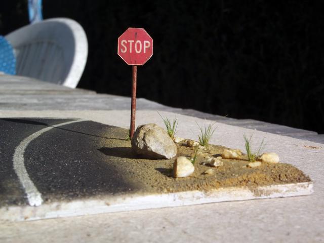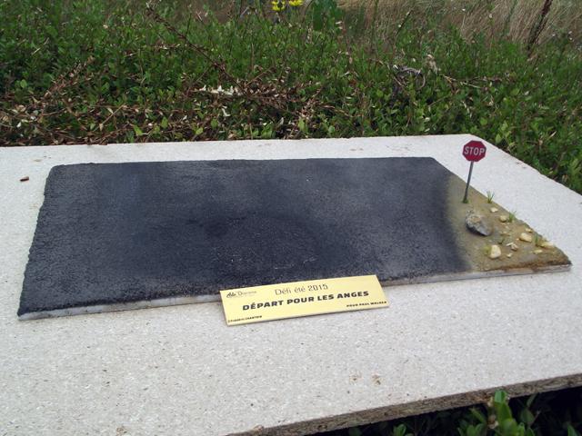 Comme la patine de l'asphalte était fini, cette fois, j'ai uniquement bouché le trou. J'aurais même pu faire une découpe rectangulaire pour imiter une réparation de la route