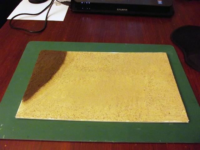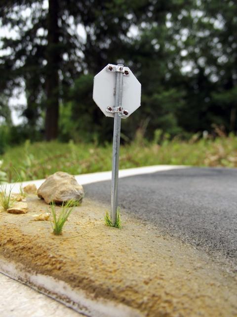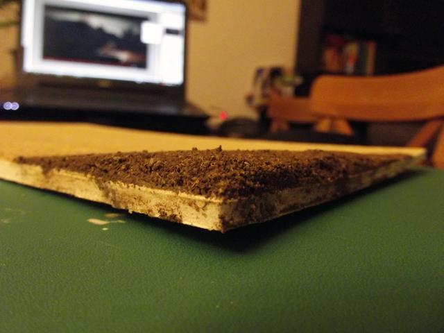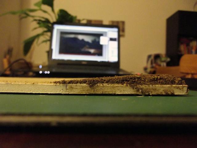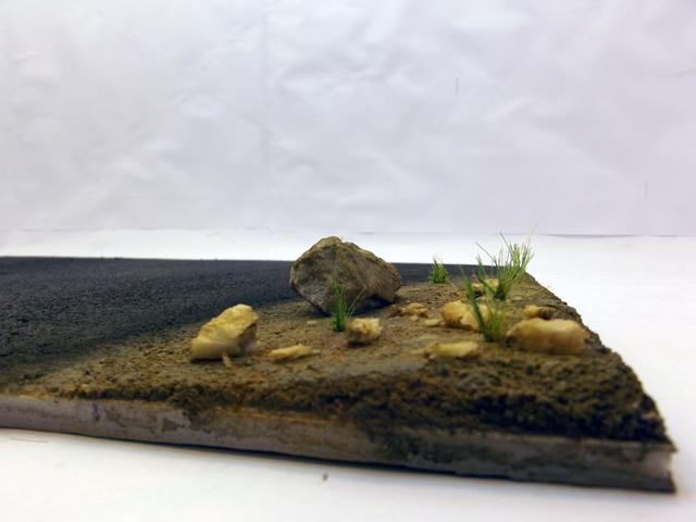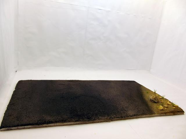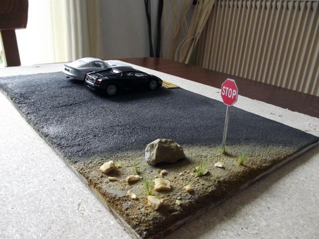 La base de ces revêtements son du sable fin pour la route et de la terre tamisée pour le bord de la route. Ces deux matériaux sont collés à la colle à bois sur une plaque de carton plume de 5 mm d'épaisseur.
