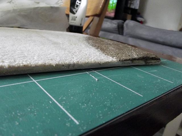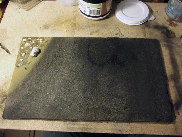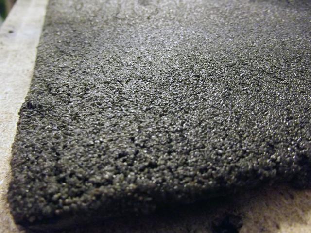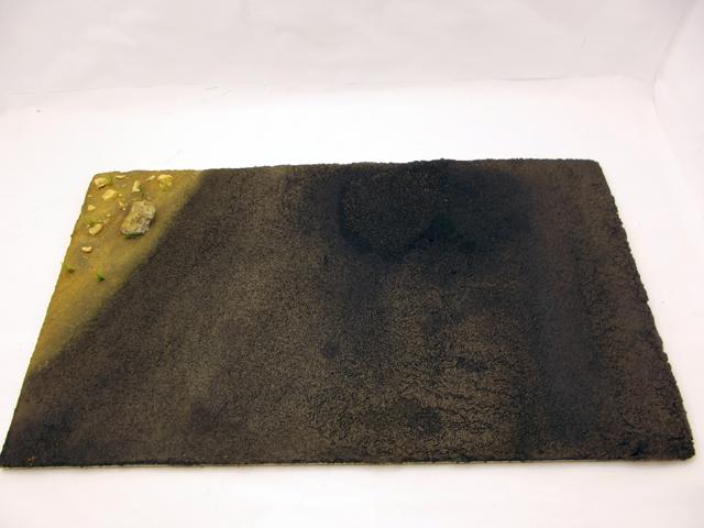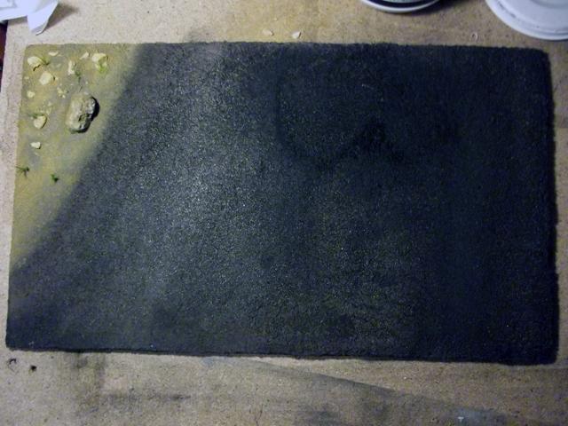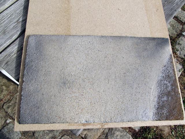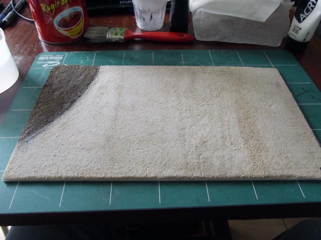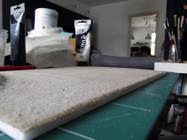 Après séchage complet, j'ai appliqué une première couche de peinture. Le sable étant très fin, la colle est restée en surface et donc la surface du sable s'est ramollie et a collé à la brosse lors de l'application de la peinture qui s'est déchirée. Donc pour avoir une surface uniforme, j'ai appliqué une troisième couche de sable que j'ai saturé en mélange eau + colle.