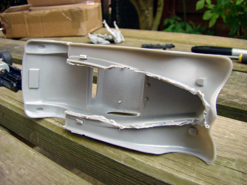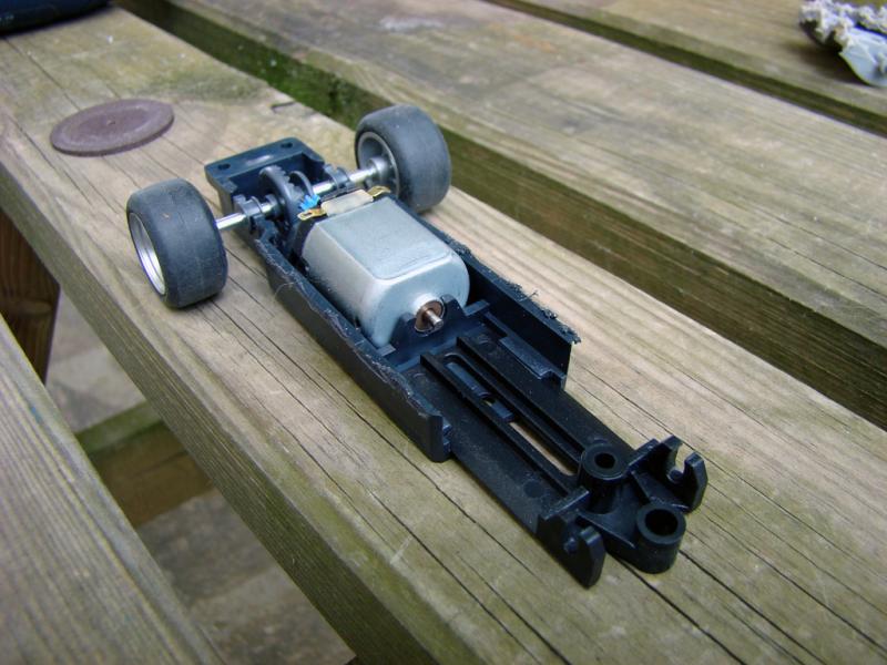 Le chassis est un PCS 32 avec quatre Jantes Ninco Mégane avec pneus Ultimatt 20,5 par 11,5.Le passage de roue a l'avant a été agrandi.Chassis fixé a l'aide de cheville à béton qui tiennent avec de la colle chaude.Le guide n'est pas encore fixé pour les photos mais il est a suspension.