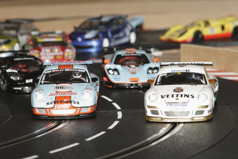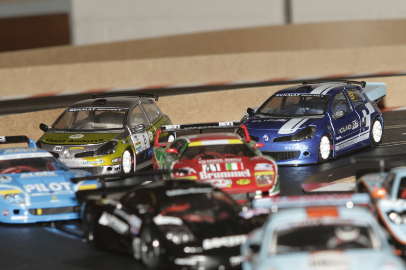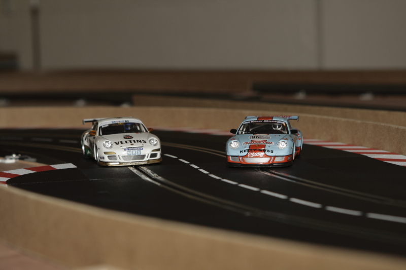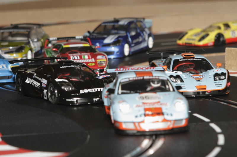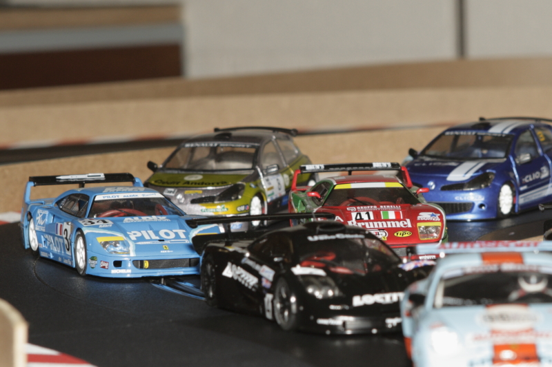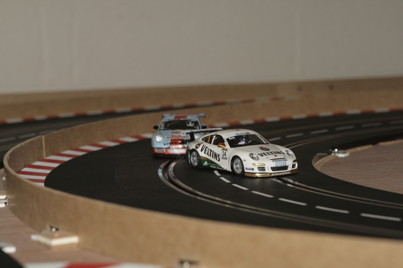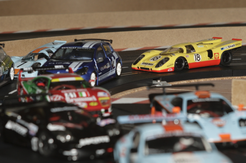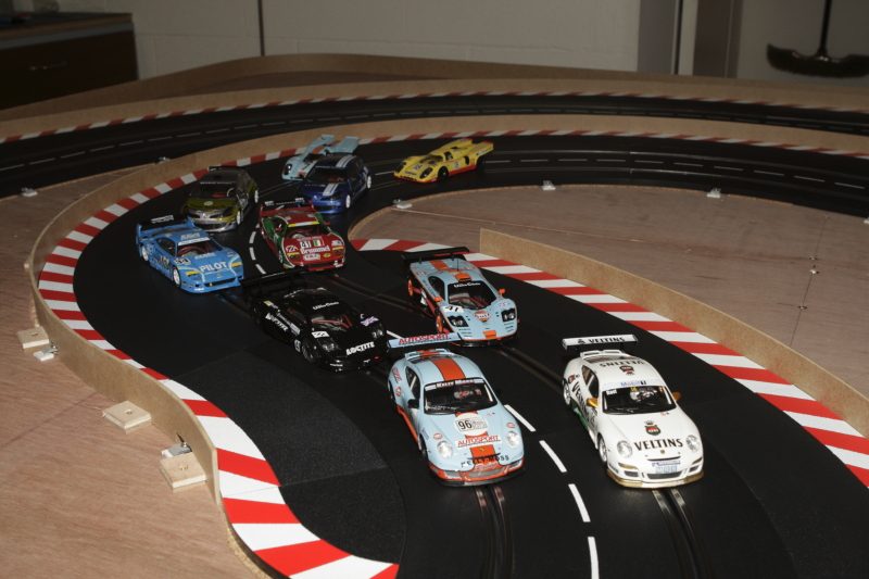 Au départ, je pars des stands (Porsche 997 Ninco), les deux autres voitures sont des ghost Carrera avec de la Patafix sur les diodes pour pas qu'elles changent de voies.Comme ça elles peuvent rouler des heures sans se percuter dans un aiguillage.