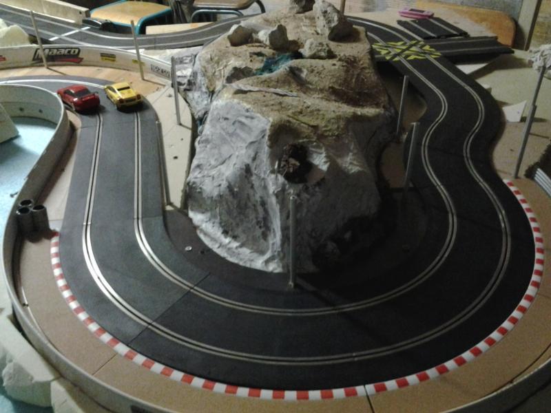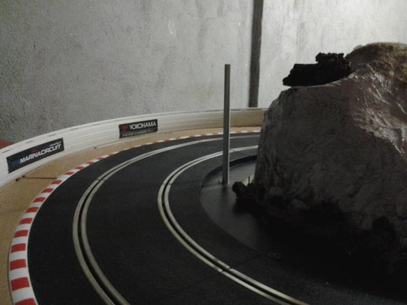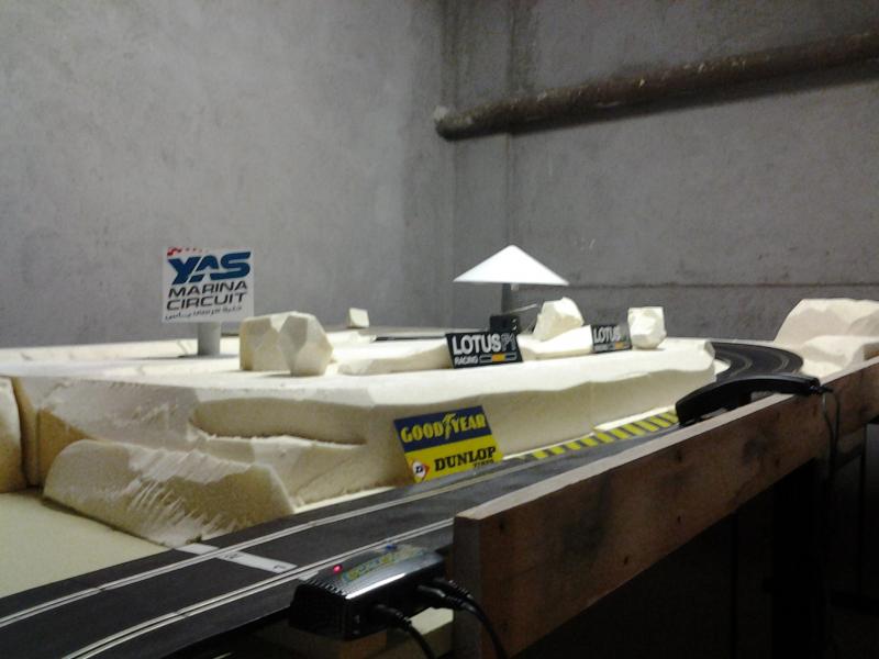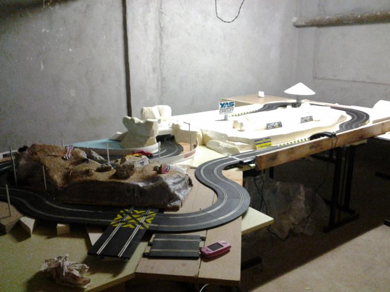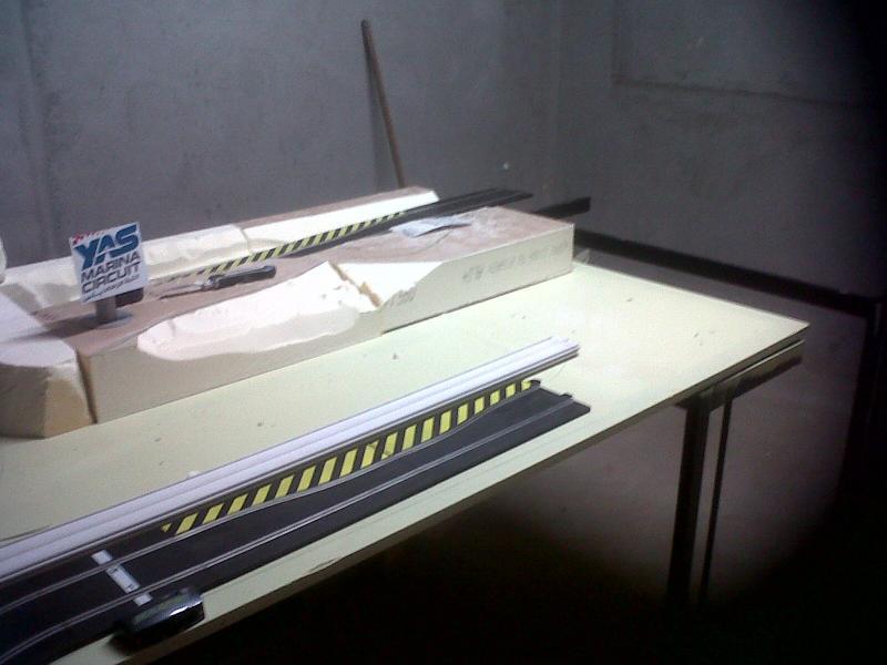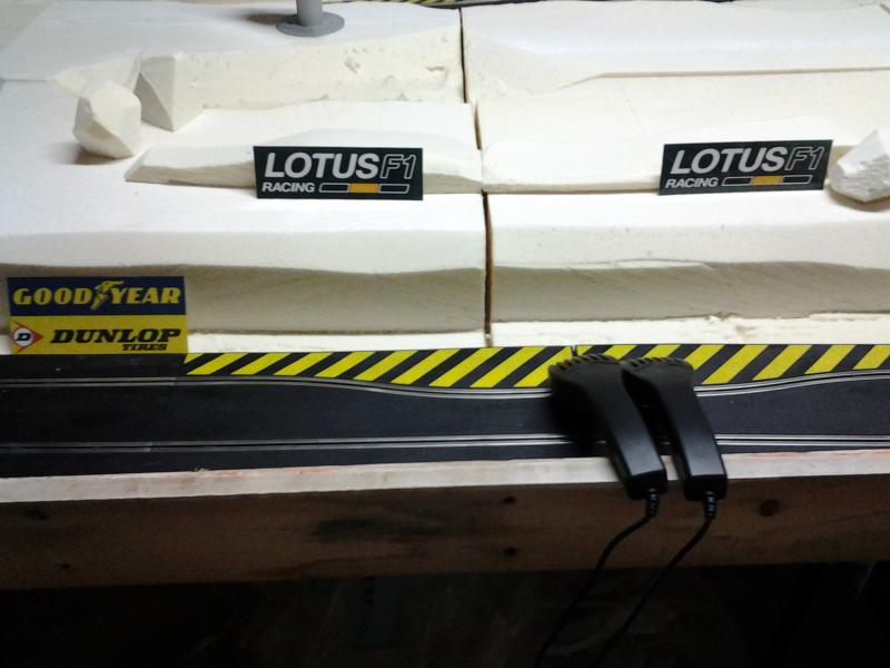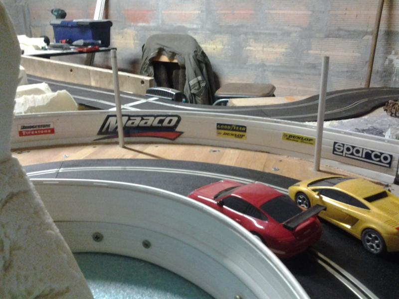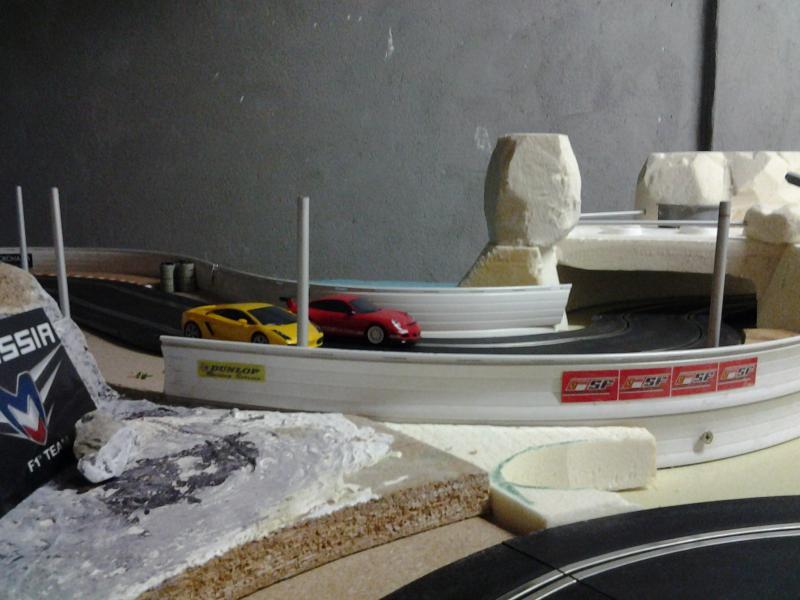 Apres essai des voitures ce week end, et quelques reglages, je trouve qu'il manque 3 bonnes longeurs de lignes droite! Je vais devoir prolonger en bout de piste ce qui m'oblige a racheter 6 rails droits standarts mais qui va me donner plus de place sur le plateau pour installer la tour que je suis entrain de preparer, et les stands a venir.. Sinon que pensez vous de la couleur des rails de securite que j'ai laissés en blanc?? je me disais que si je les bombés en gris alu ce serait pas mal non??
