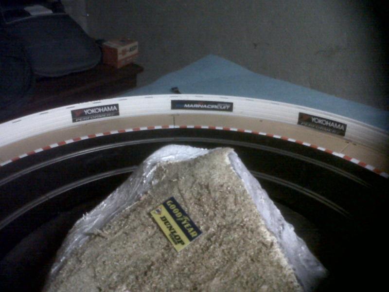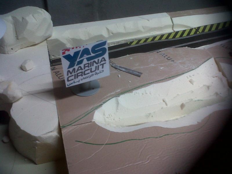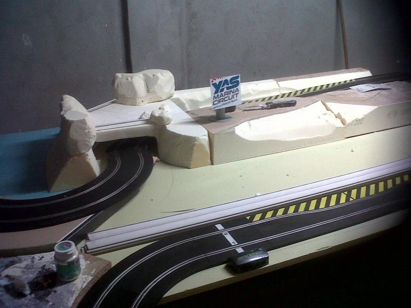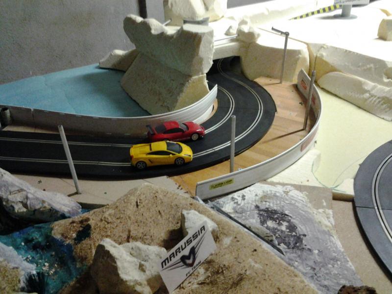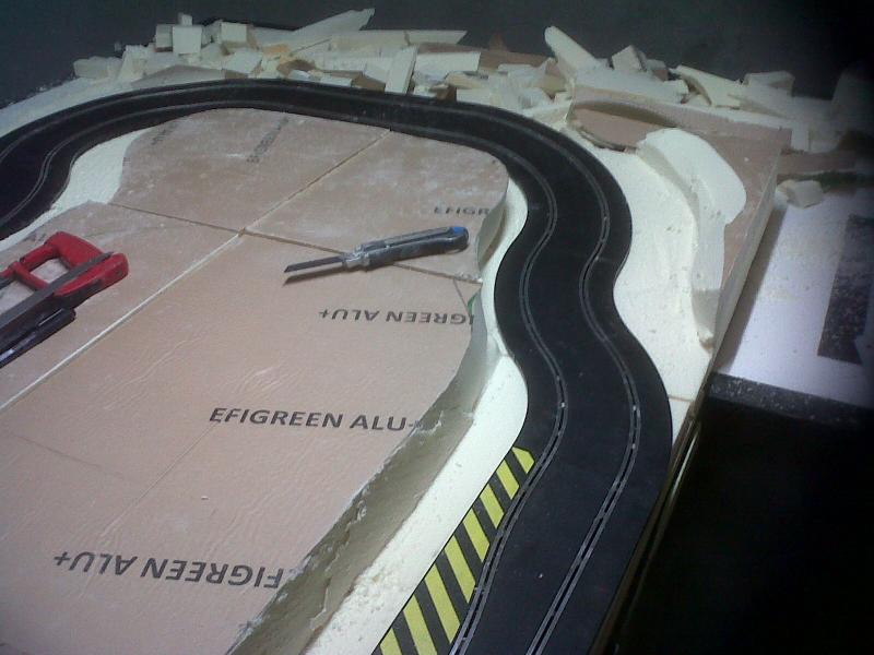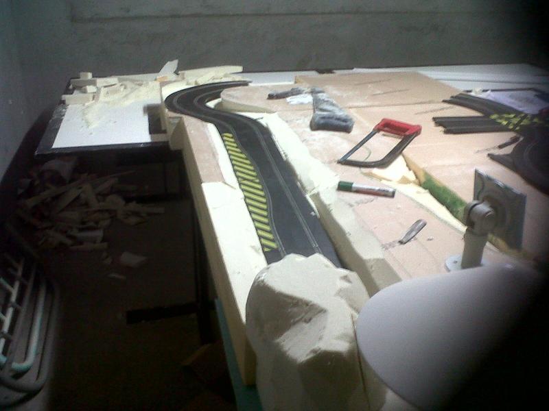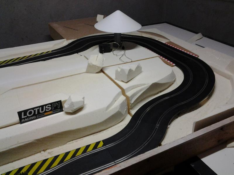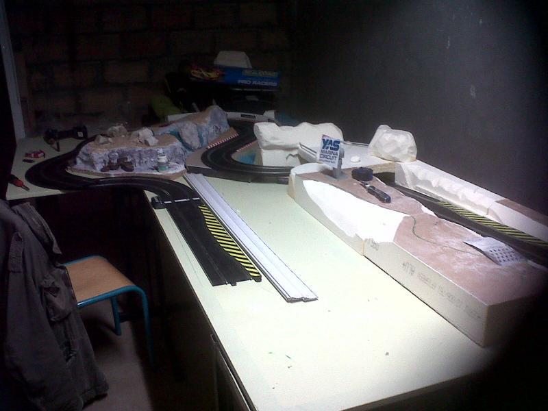 Apres essai des voitures ce week end, et quelques reglages, je trouve qu'il manque 3 bonnes longeurs de lignes droite! Je vais devoir prolonger en bout de piste ce qui m'oblige a racheter 6 rails droits standarts mais qui va me donner plus de place sur le plateau pour installer la tour que je suis entrain de preparer, et les stands a venir.. Sinon que pensez vous de la couleur des rails de securite que j'ai laissés en blanc?? je me disais que si je les bombés en gris alu ce serait pas mal non??
