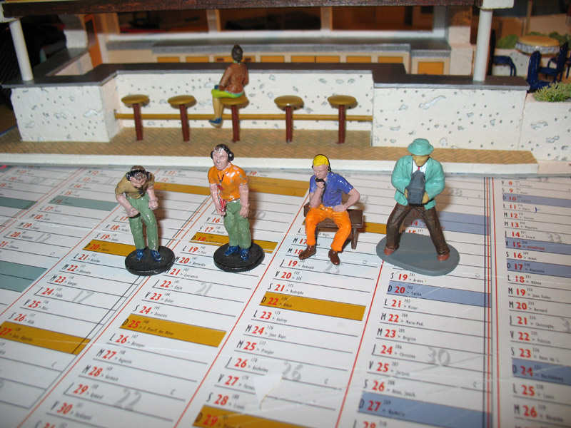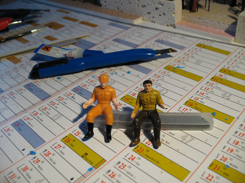 pour les bonhommes, tu peux toujours recycler des soldats plastique 1/35eme (ça coute genre qques euros le sac) , hop un peu de modif et c'est bon...sinon, du bonhomme assis de modélisme ferroviaire, ça existe.