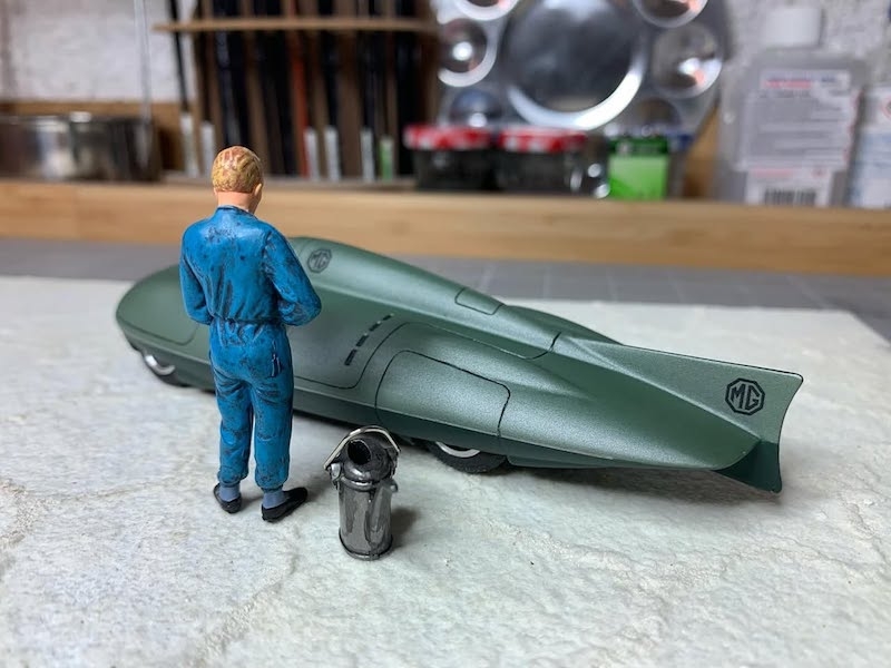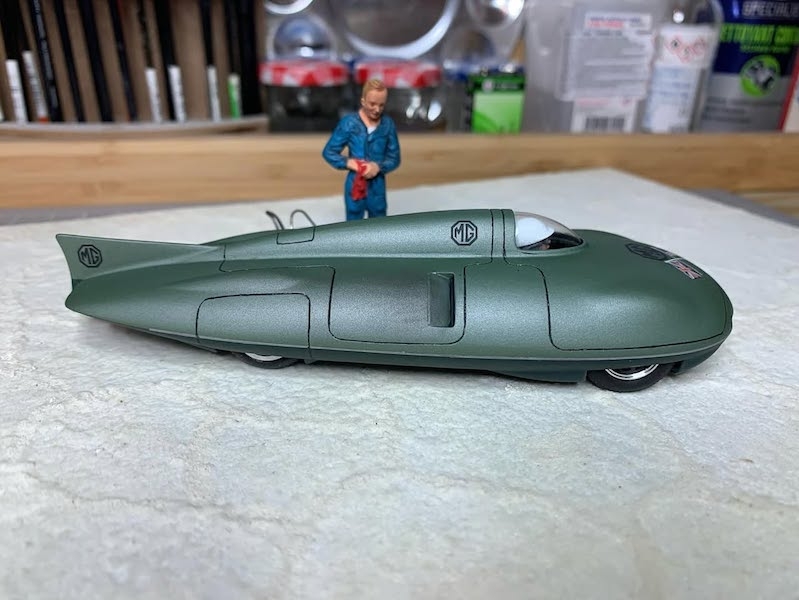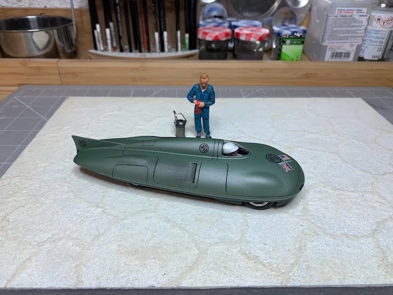 C'était un kit prépeint et j'ai pas mal galèré pour effectuer deux masquages afin de peindre la partie inférieure en vert très foncé , puis réaliser le jonc qui fait le tour de l'auto , séparant les deux coloris ( peinture argent et au pinceau avec du scotch de carrossier)