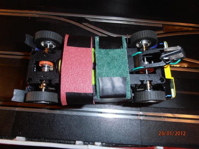 Mais une idée : utiliser de la gomme spéciale pour nettoyer les rails (il y en a chez Mondialtec), en découper des morceaux que tu colles sous le châssis derrière le guide avec de l'adhésif double face