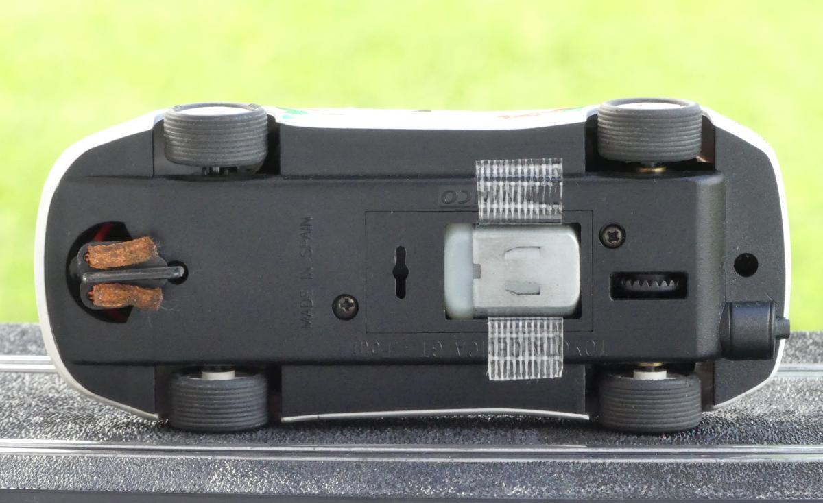 Le modèle pris en photo ici a beaucoup roulé, on y aperçoit les stigmates des courses passée. Le contour des stickers est noirci, mais ils ne se décollent pas malgré les nombreux chocs et manipulations. Les rétros, moulés dans la masse et l'aileron sont bien en place. J'ai également fixé le moteur avec du scotch renforcé, aujourd'hui on pourrait faire un petit trou sur le côté du support moteur pour y fixer une vis.