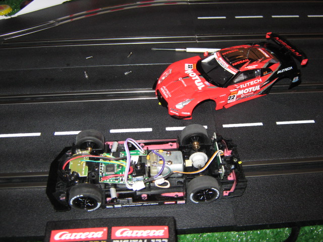 Les dernieres voitures comme la Sirroco et quelques autres n ont plus le Housing qui contenait le moteur et les roues arrieres comme les Bmw et Porsche Digital 132 retenu par une visse comme exemple.Je trouve que ca commence plus a ressembler a des chassis Fly ou Slot-it dans le cas de cette Nissan.Je dis pas que c est pareil.Pas le meme systeme de magnets non plus et on peut tout enlever de l intérieur,avant c etait des magnets ajustables de l extérieur avec des spacers.j espere qu ils vont toutes le construire ainsi et qu ils ont peut-etre appris a faire des bons chassis au lieu de trucs oesotériques comme les chassis Pro-x avec des guides et des springs tout intégré pis un magnet qui suit le guide..en tout cas...Cette voiture est performante,tres performante.J aimais bien ma Peugeot 908 mais celle-ci est plus légere et agressive dans l ensemble de la chose.Peut-etre qu a partir de ce point,les gens sur le forum vont plus apprecier ces Carrera .Ah oui..j y pensait plus,reste le guide...A plus.