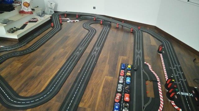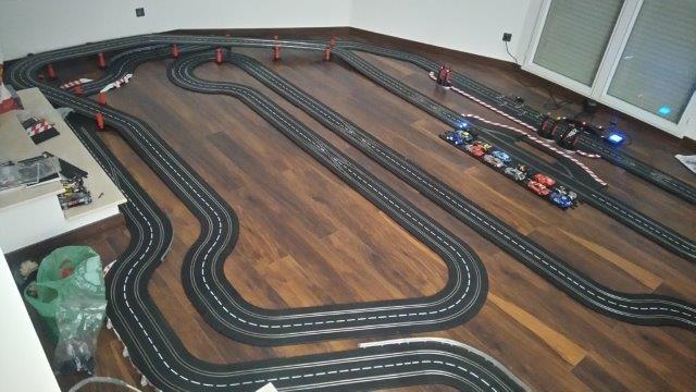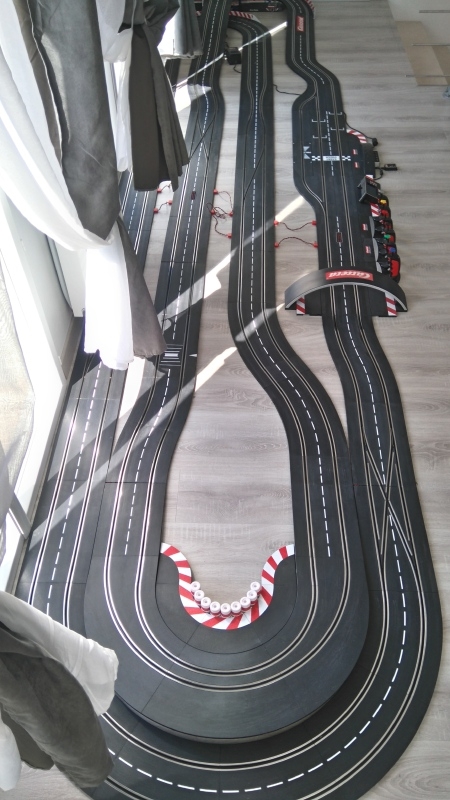 Je n’ai pas encore de pièce aménagée pour une installation en hauteur donc le circuit est posé au sol… les puristes vont me siffler, ce n’est pas le top j’avoue mais pour les gosses c’est plus pratique ;).
