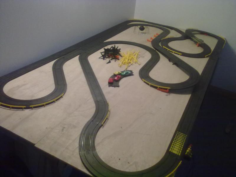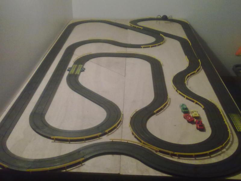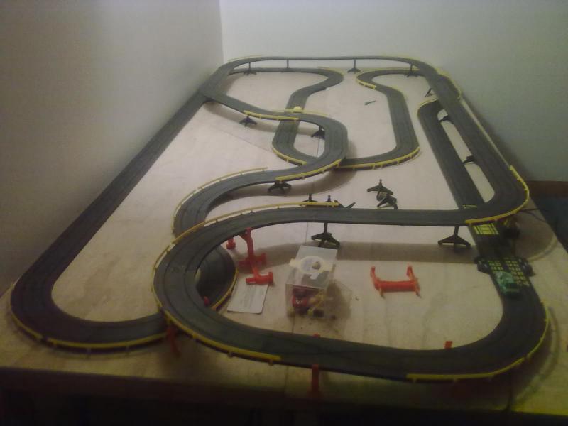 Bonjour a tous, voiolà 3 photos de ma piste tyco, la premiere circuit un peu aérien, la seconde laissant la part belle aux lignes droites et la dernière avec une partie stadium.