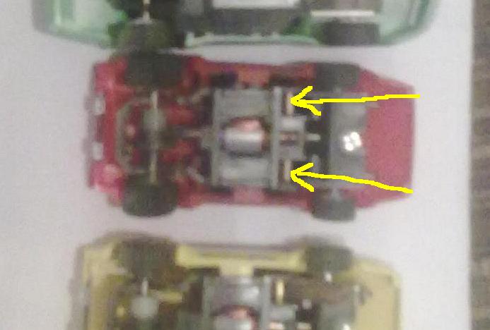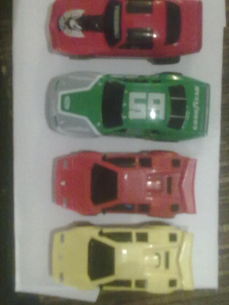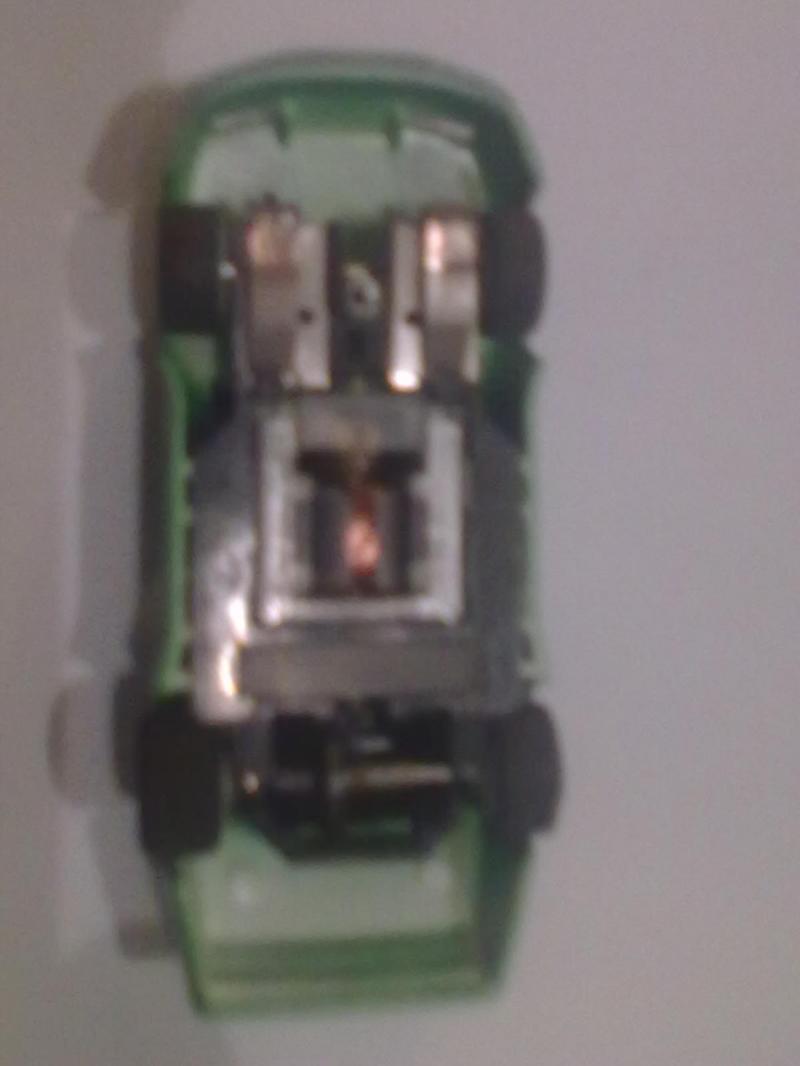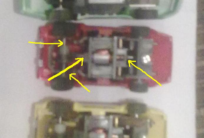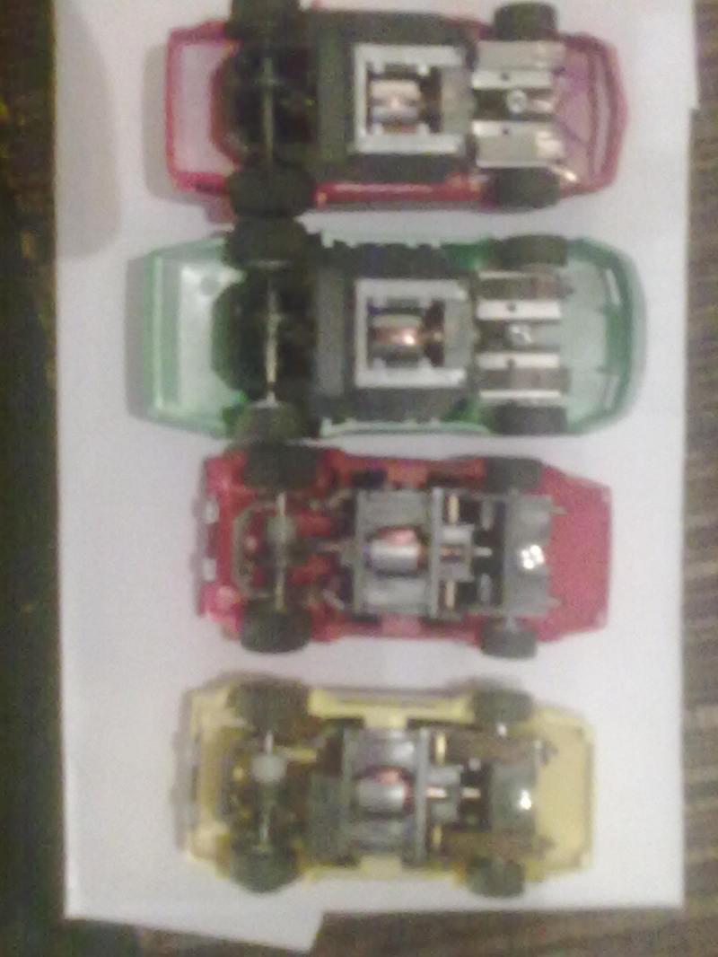 Il y a deux lamborghini une qui va trés bien et l'autre à laquelle il manque les 2 frotteurs et les deux ressorts.Les deux autres voitures dont la verte semblent être des chassis "wide" et seule la verte roule mais pas aussi vite que la lambo, la camaro s'allume (elle est eclairée) mais ne roule pas (charbons surement).
