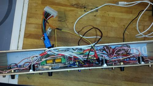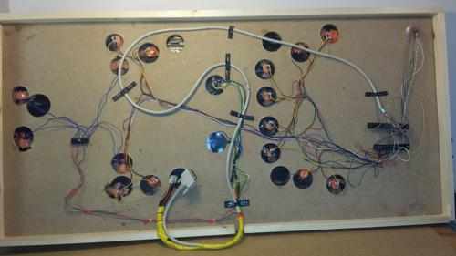Après un petit week-end de bricole, le poste des commandes est câblé et relié aux phidgets, un petit tour via photoshop pour l'habillage de la boiboite, un petit coup de pinceau de colle à bois la dessus pour faire joli.