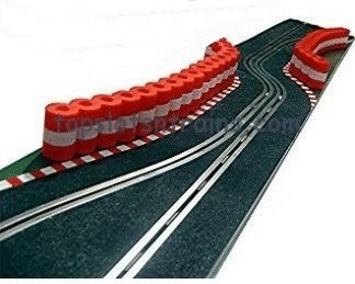 ..même pas : les pneus sont en mousse, donc pas de soucis et les touchettes sont sans risque vu que les deux autos ont de la vitesse. Et puis, quand les deux pilotes sont habitués à la chicane et savent céder à l'entrée, c'est sans risque!