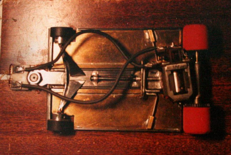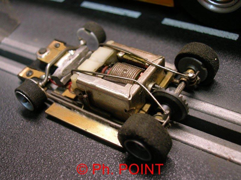 Par contre attention, je ne pense pas qu'on puisse faire tourner ce type de chassis sur des pistes plastique. - Il faudrait remplacer le guide ( beaucoup plus profond que sur les voitures actuelle ) - La puissance du moteur. Je ne sais pas si l'alimentation des pistes actuelles suffirait. A mon époque on fonctionnait avec des batteries de voitures. - La résitance de la poignée qui aujourd'hui est de 45 homs il me semble. Pour le type de moteur dans ces vehicules il fallait du 4 homs. Et là je ne parle que de la catégorie production. Il faut totalement oublier la catégorie sport Europe ou F1.