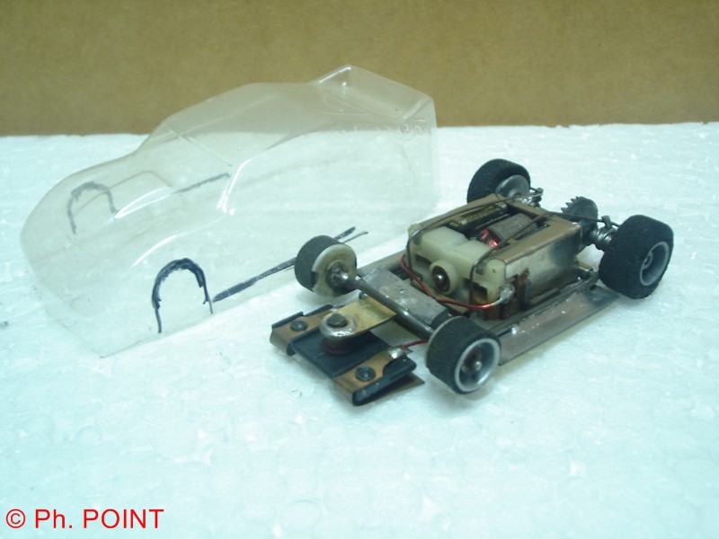 Ce châssis HO était prévu pour une coque thermoformée, pas une AFX ou autre clipsée.