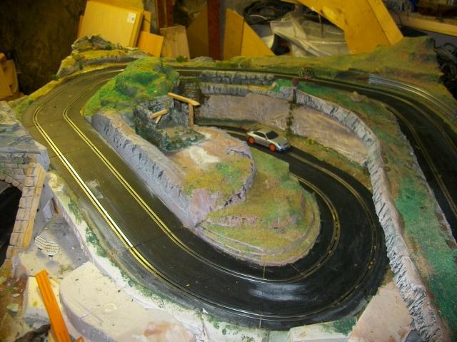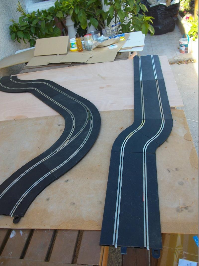 je cherche des idées .. manquant de place ... mon circuit s installe en extérieur , j, ai construit des planches de 1m20 sur 1 m20 qui peuvent se ranger facilement !