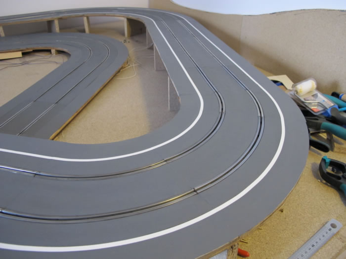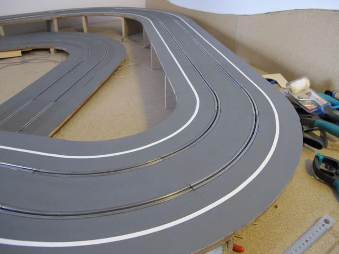 J'ai renoncé au filet autocollant parce que .... ca se décolle! En revanche il faut masquer à droite et à gauche si on veut un truc régulier et ca c'est coton (et long! et ca demande des dizaines de mètres de scotch adhésif), surtout dans les virages. Et puis il faut immanquablement reprendre à la fin les coulures avec le gris de la piste. Enfin je dis ca mais toi tu es plus doué que moi, t'auras surement pas de coulure.