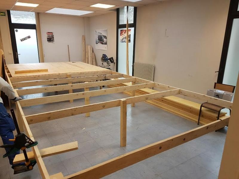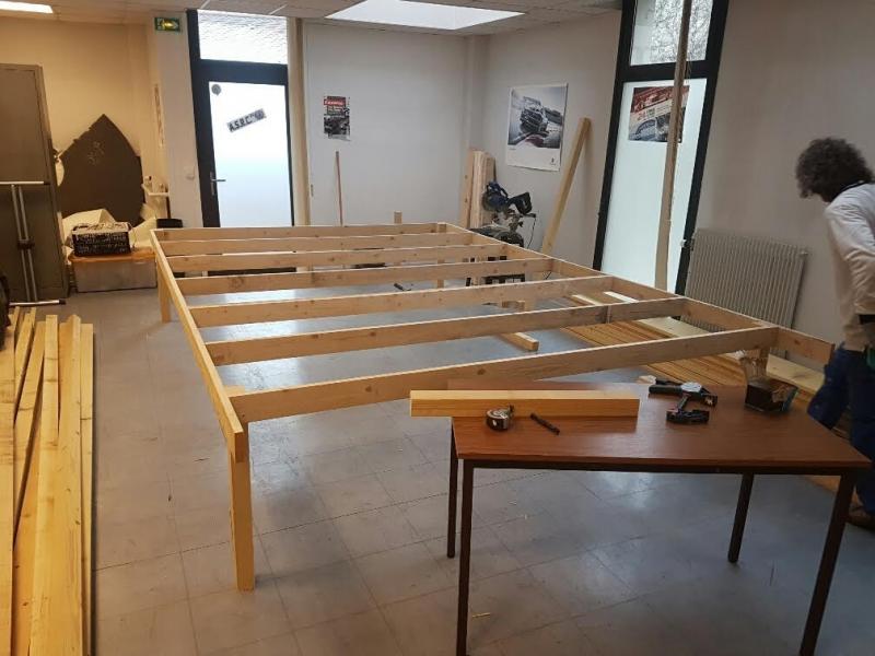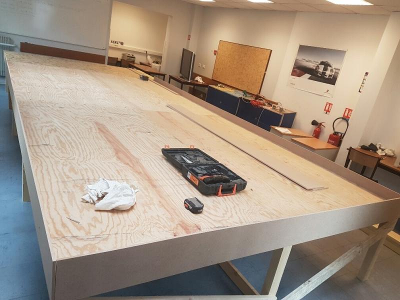 après démontage de notre ancienne piste bois et stockage pour une futur utilisation, voici le début du montage du plateau bois support de piste pour notre nouvelle piste 4 voies carrera dans notre deuxième salle mise a disposition par la mairie de Champagne sur Oise gratuitement plateau 6.10 x 2.80 m pour recevoir le trace suivant