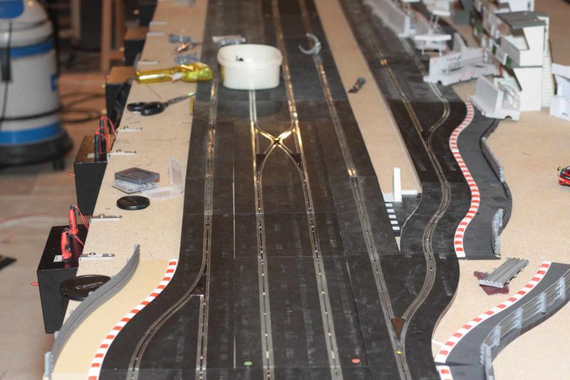 Il existe chez scalex un rail monovoie en courbe, j'ai utilisé cette possibilité pour avoir une voie des stands bien séparée de la piste, comme sur un vrai circuit. J'ai ensuite inséré un 2ème rail de pit stop pour voir 2 voies. Une sur laquelle on roule et l'autre non électrifiée pour y mettre des véhicules statiques.