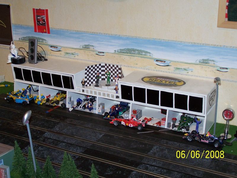 petit bricolage du dimanche......j'en avais marre d'avoir la pitlane qui ne ressemblais a rien, trop pres de la piste.........j'ai donc opter pour la suppression du batiment de stand, pour avoir la place d'avoir une vrai pitlane, inspiré de ce qui se fais en champcar ou en nascar, re-adapter pour la F1........pas dis que je ne fasse un batiment "fictif" derriere, a voir.......