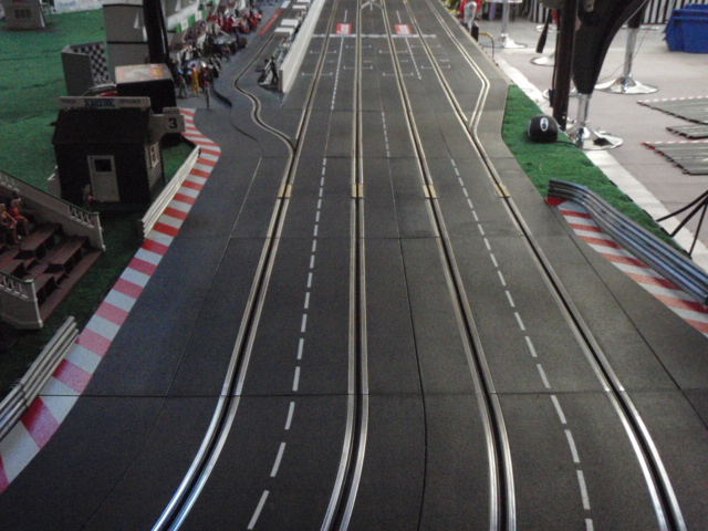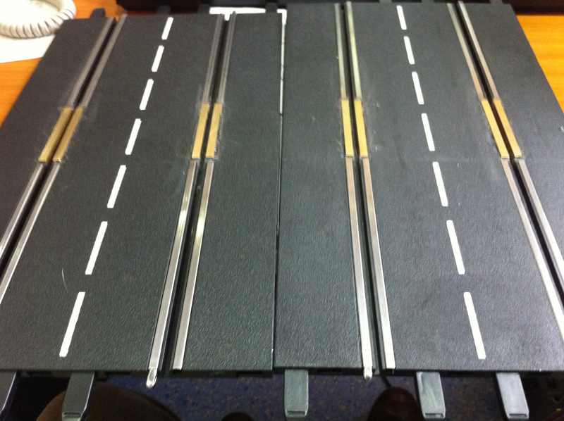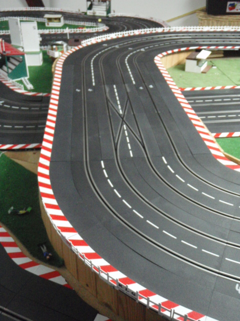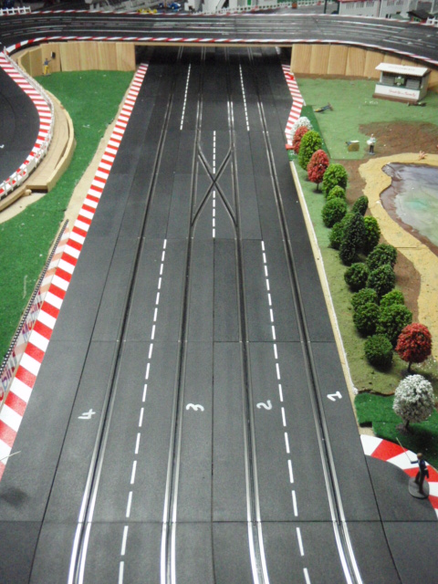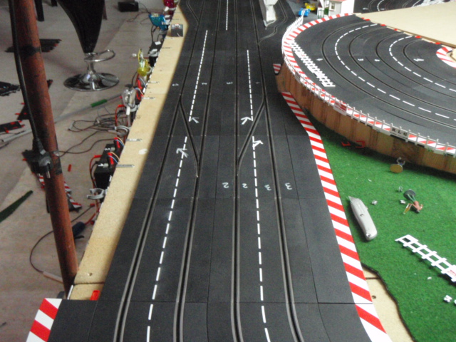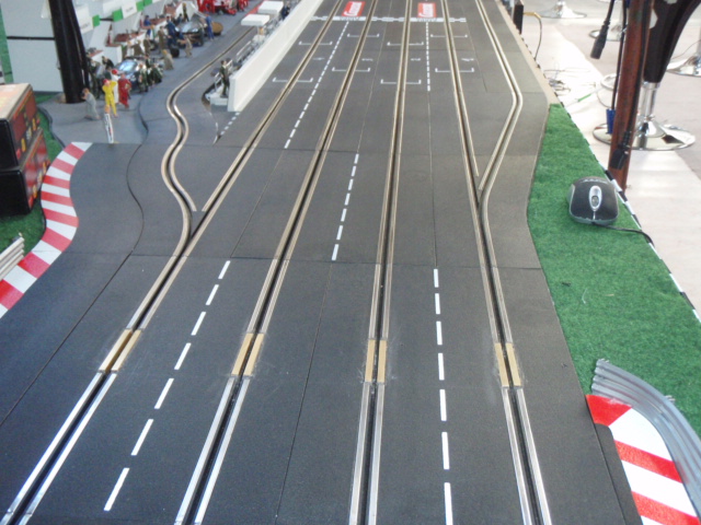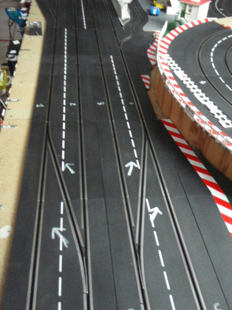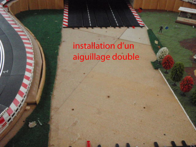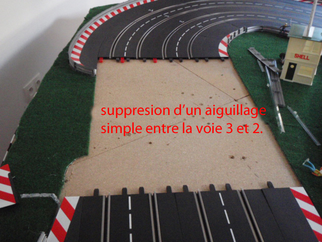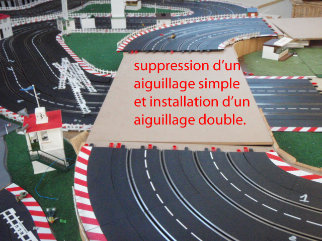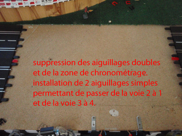Démontage de la zone de chronométrage et des 2 aiguillages simples correspondants. Et installation de 2 aiguillages simples permettant de passer de la voie 3 à 4 et de la voie 2 à 1. Ces 2 aiguillages simples sont situés avant la zone d'entrée des stands et devant la zone de retrait des voitures. En plus cette modification évitera bien des soucis et des erreurs de sélection d'aiguillage et de se retrouver par inadvrtance dans le muret des stands (situation vécue plusierus fois en course).