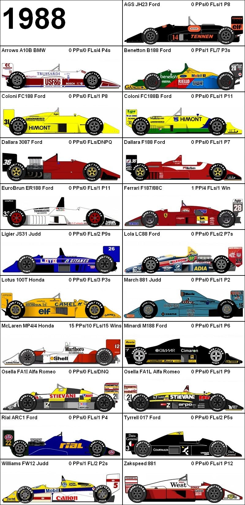 La Leyton House et la Brabham sont de bonnes idées, les Ferrari et McLaren ne sont pas des surprises, par contre on aurait pu s'attendre à voir une Lotus jaune décorée par un dromadaire ou une Williams-Honda. Cela viendra sans doute ...