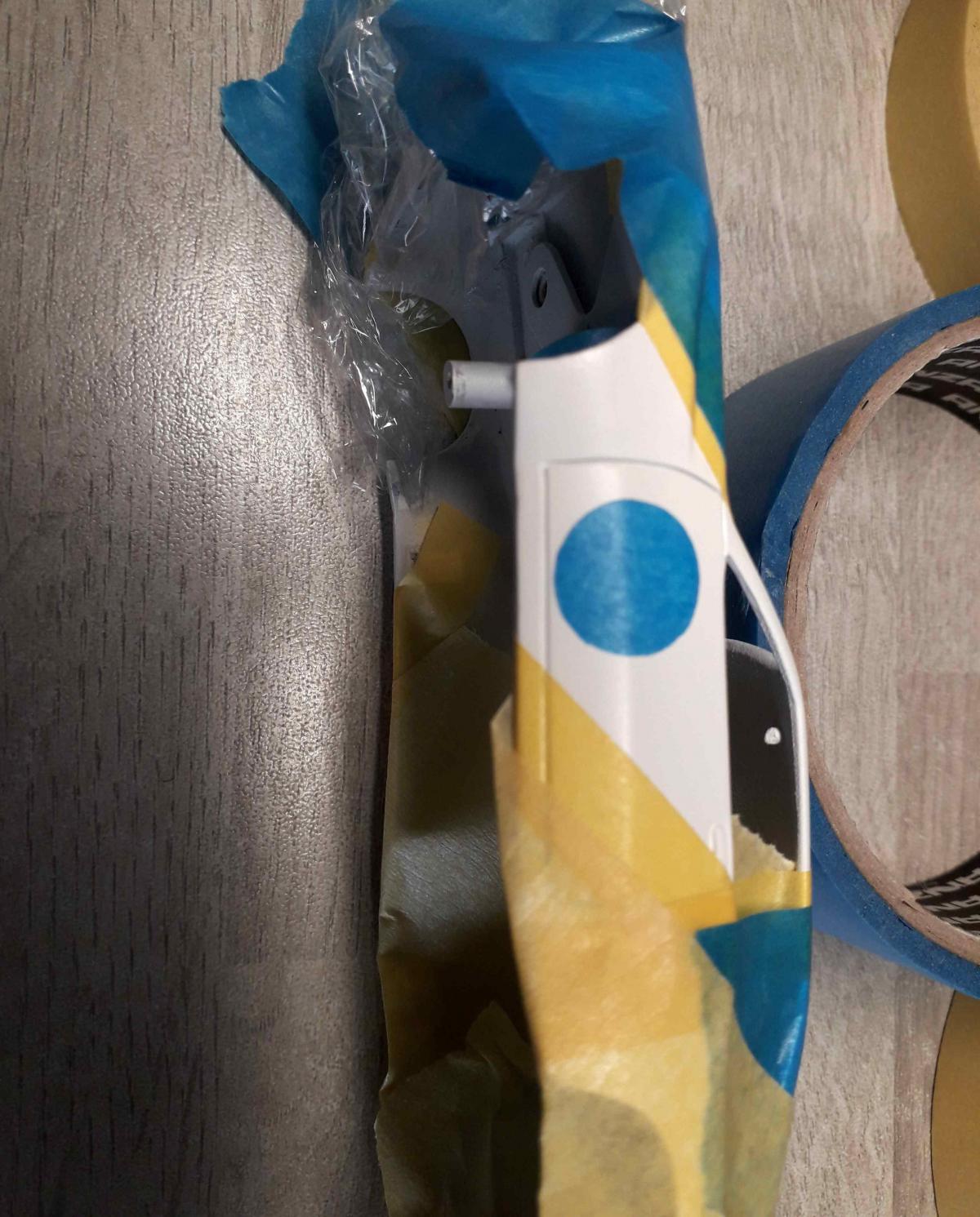 Là c'est le pourquoi du comment j'utilise des peintures bases mattes , tu n'as pas besoin d'en mettre beaucoup car très opaques, évidement faut utiliser un aérographe, et surtout, c'est impératif, il faut ôter de suite tout le masquage tant que la peinture est encore humide, celle ci se lisera toute seul, à contrario si tu ôtes le masquage peinture sèches, celle ci épousera l'épaisseur du tape, d'où le raccord. La photo n'est pas très lourde, il y a un léger raccord quant même.
